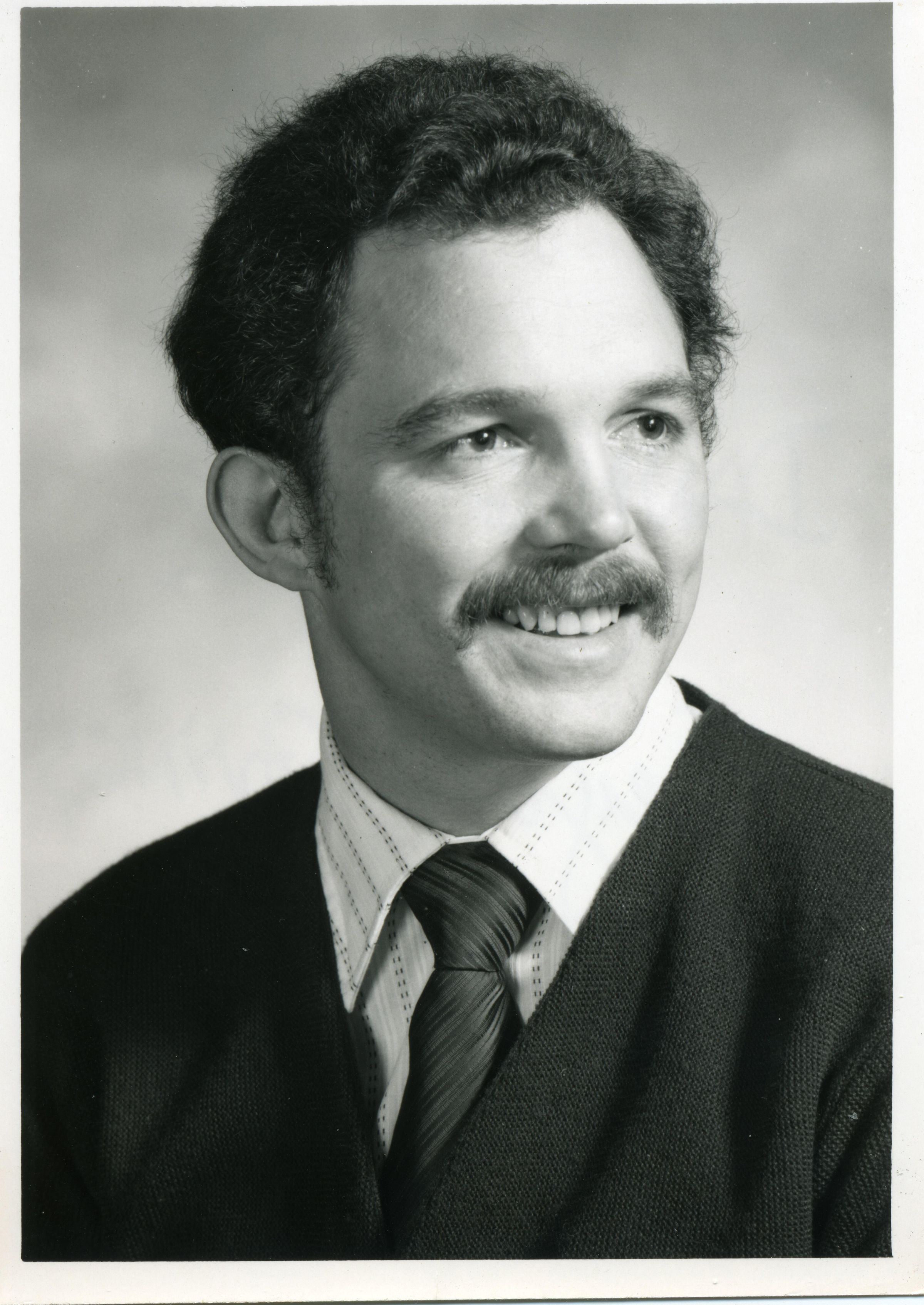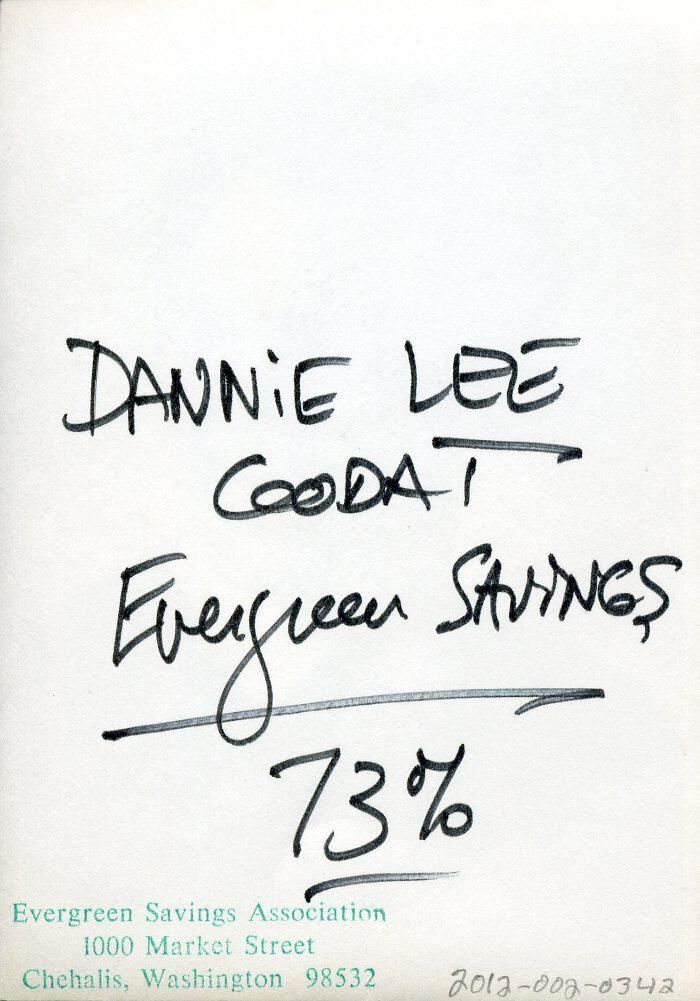 Black and white photo of a smiling Dannie Lee Codat. He has dark wavy hair and a mustache. He is wearing a dark suit over a white, striped shirt and a dark tie. There is a white border on all sides. On the back in felt pen is "Dannie Lee Codat, Evergreen Savings, 73%". A stamp in green ink says "Evergreen Savings Association, 1000 Market Street, Chehalis, Washington 98532".Made/Created