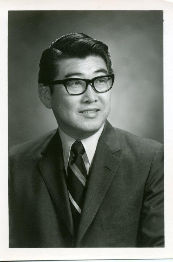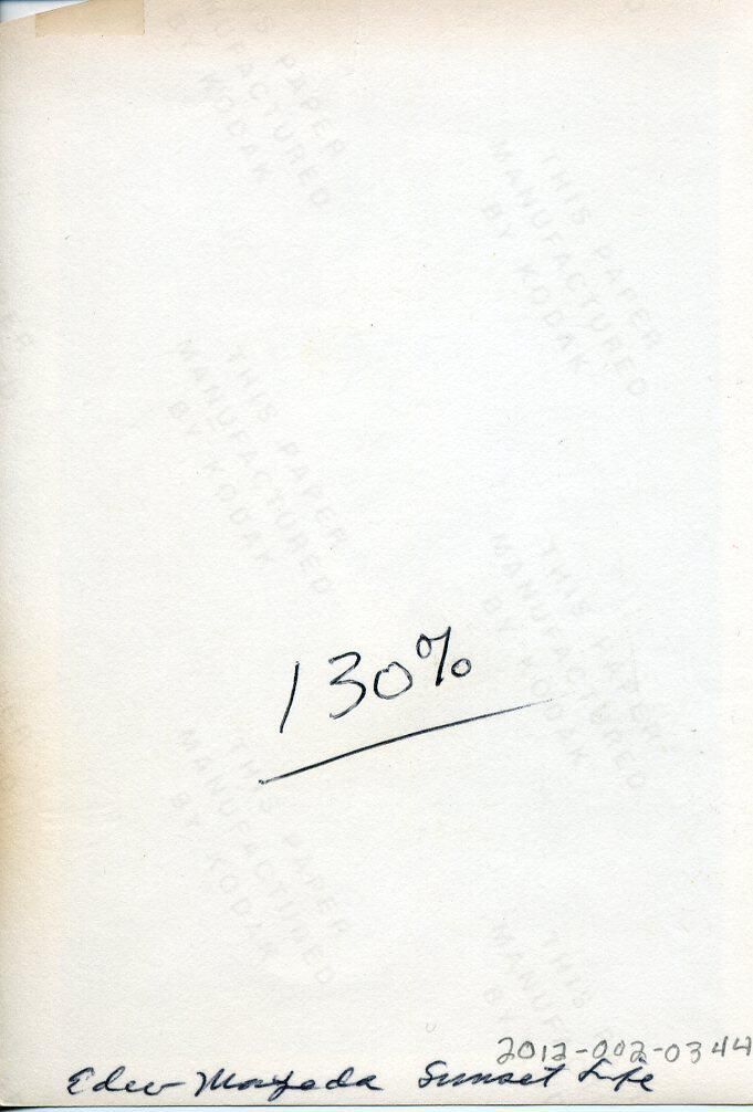 Black and white photo of E.Y. Mayeda. He has dark hair and is wearing glasses. He has on a dark suit over a white shirt and a striped tie. There is a white border on all sides. On the back in ink is "130%" and in different ink "Edee Mayeda, Sunset Life".Made/Created