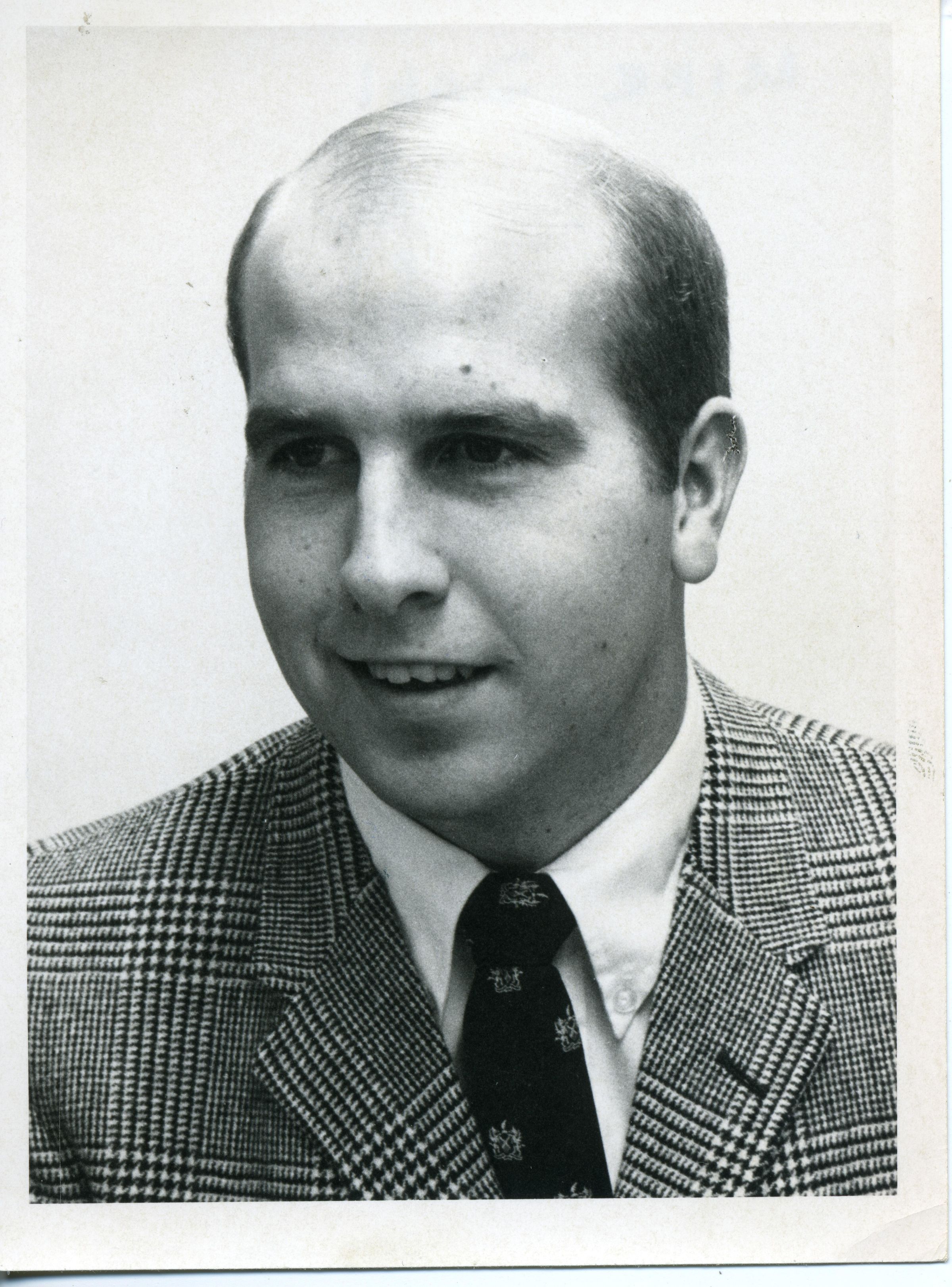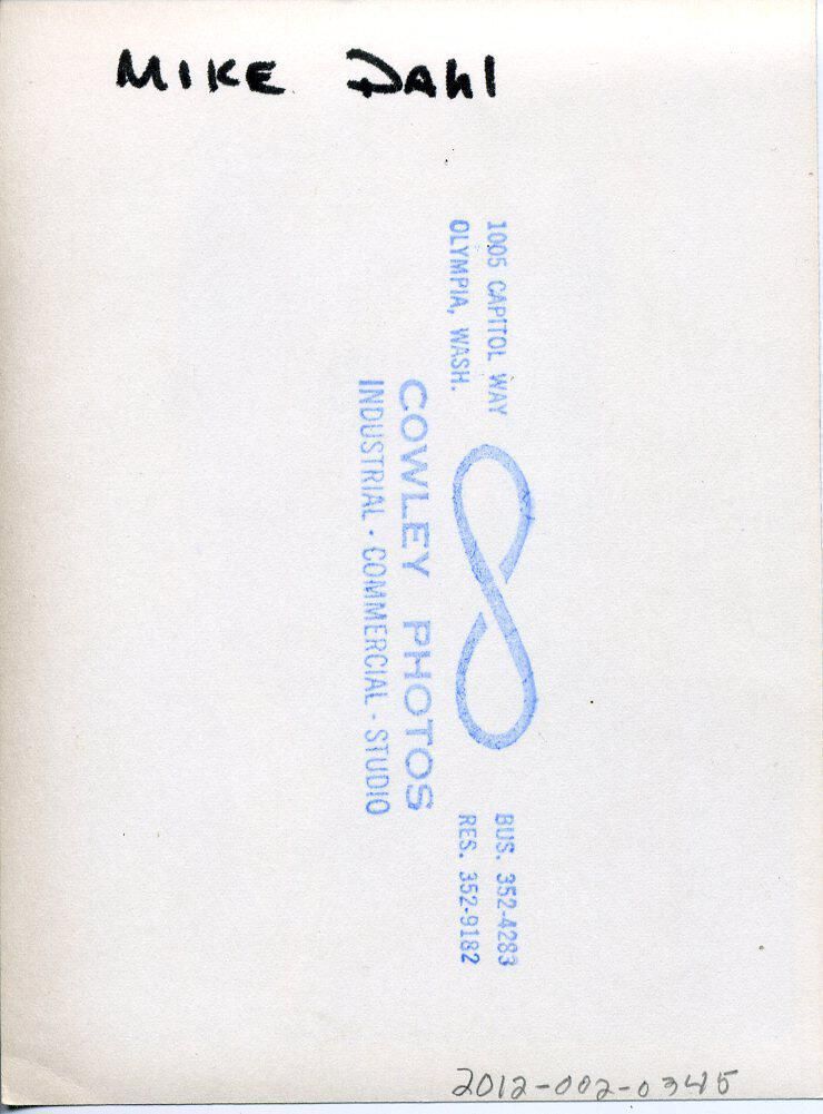 Black and white photo of Mike Dahl. He is mostly bald with a fringe of dark hair. He is wearing a jacket with a Glen Plaid pattern over a white shirt an a dark tie with a scattered pattern. There is a white border on all sides. On the back in felt pen is "Mike Dahl" and a stamp in blue ink that has a symbol and "1005 Capitol Way Olympia, Wash. Bus. 352-4383 Res. 352-9183 Cowley Photos Industrial - Commercial - Studio".Made/Created