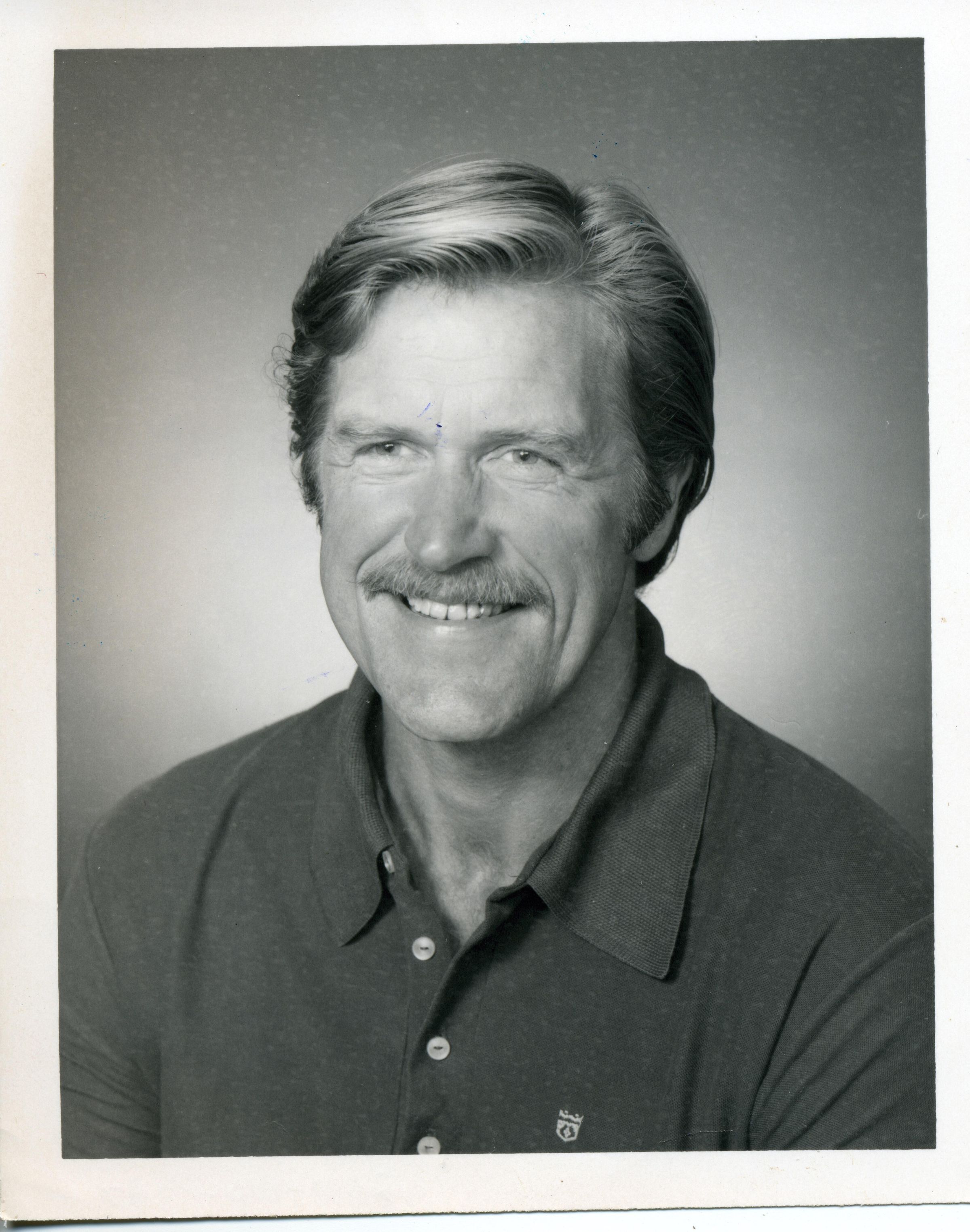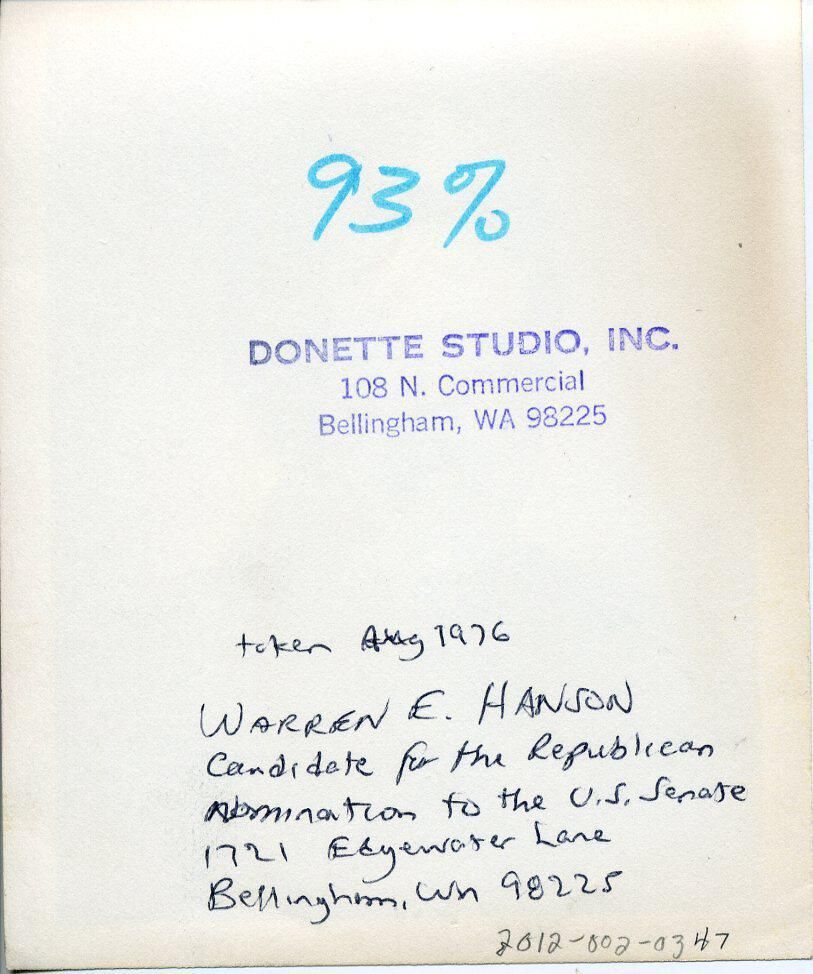Black and white photo of a smiling Warren E. Hanson. He has light colored hair and a mustache. He is wearing a dark shirt open at the collar with white buttons visible on the front. There is a white border on all sides. On the back is blue felt pen is "93%", a stamp that says "Donette Studio, Inc., 108 N. Commercial, Bellingham, WA 98225", and in ink "taken Aug 1976, Warren E. Hanson, Candidate for the Republican Nomination to the U. S. Senate, 1721 Edgewater Lane, Bellingham, Wn 98225".Made/Created