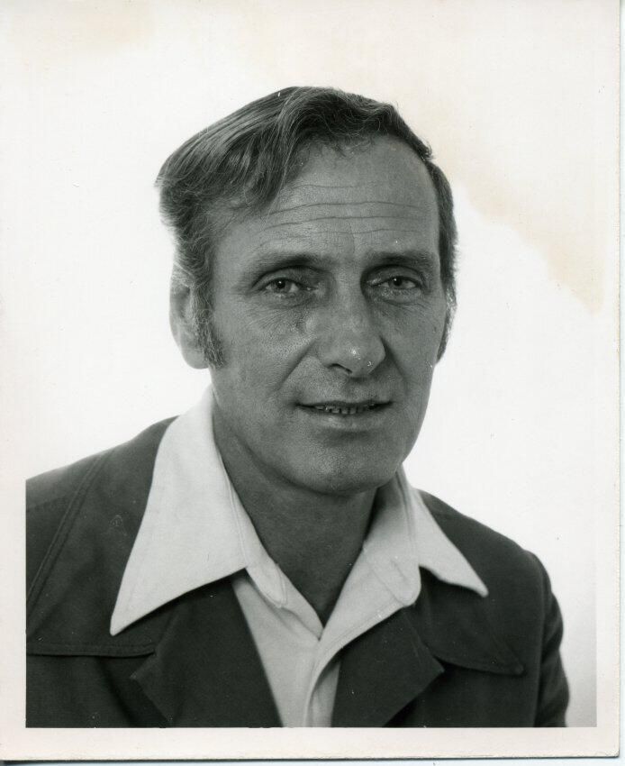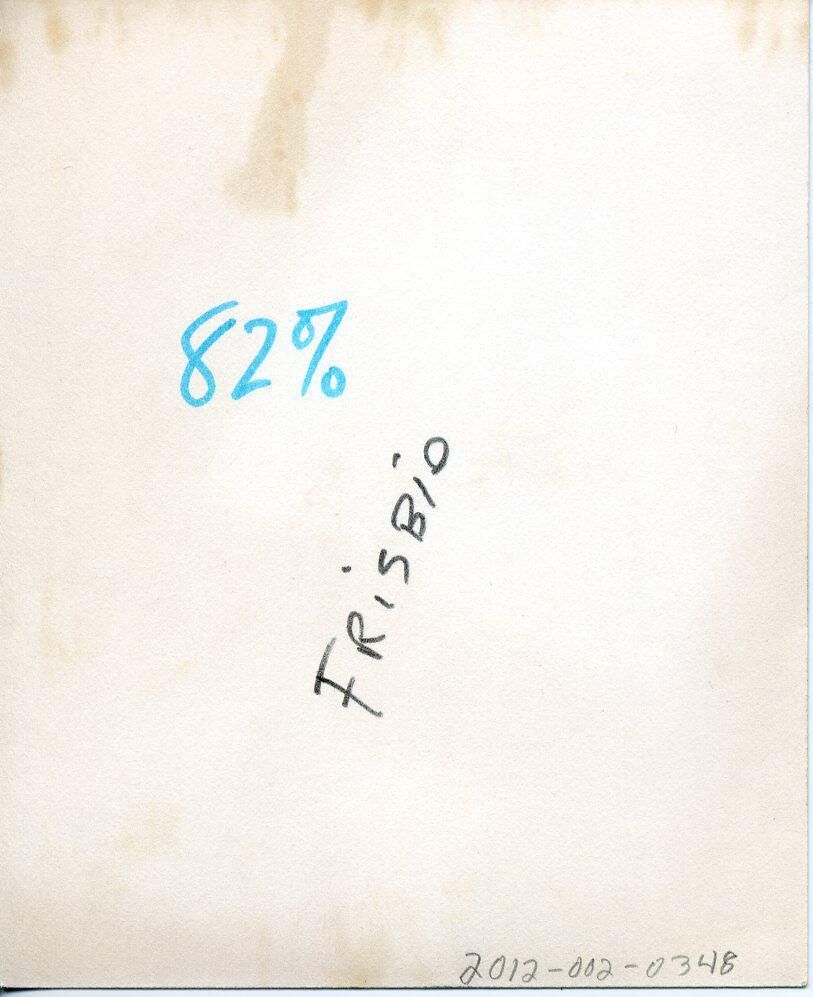 Black and white photo of a man identified as "Frisbio. He has light colored hair and is wearing a dark jacket over a white shirt, the collar of which is outside the collar of the jacket. There is a white border on all sides. On the back in blue felt pen is "82%" and in dark ink the name "Frisbio".Made/Created