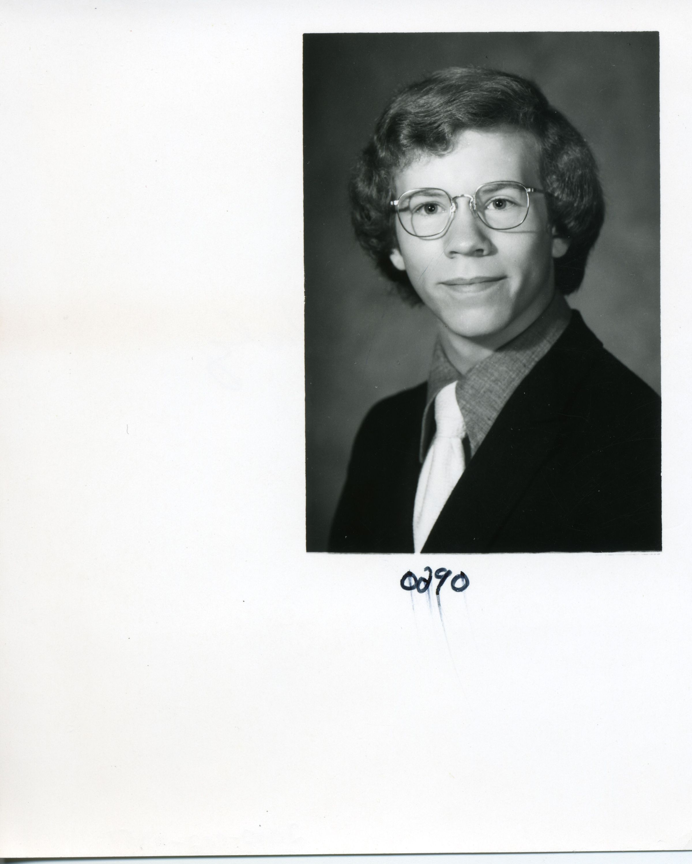 Black and white photo of Robin Walz. He has dark hair that falls to his shoulders and is wearing glasses. He has on a dark jacket over a gray shirt and a white tie. The image is in the upper right corner of the print. Below the image is in ink "0290". On the back in ink is "Robin Walz" and "108%".Made/Created