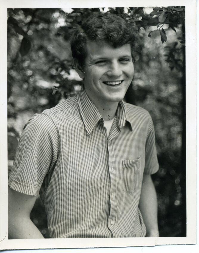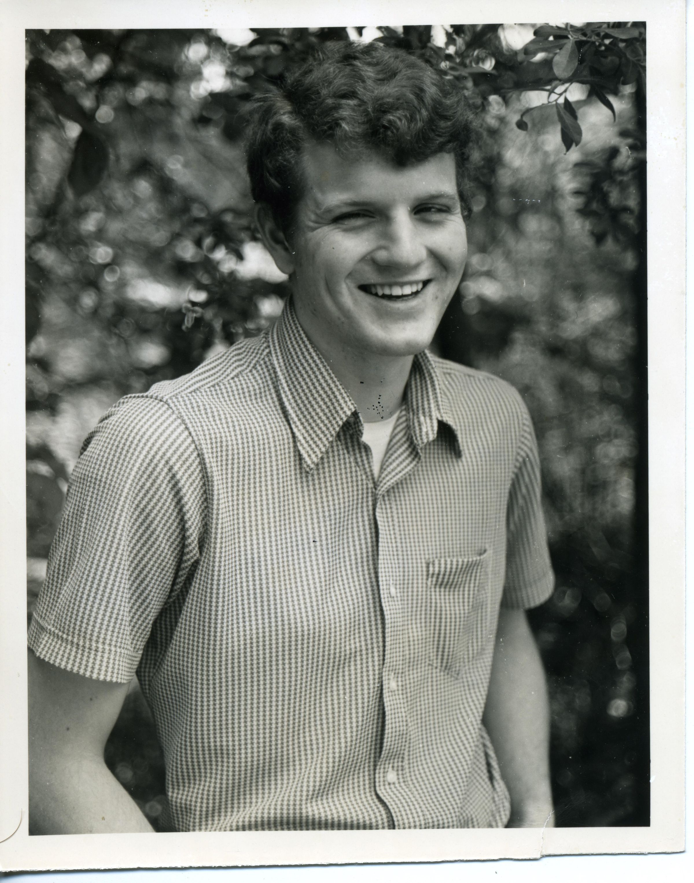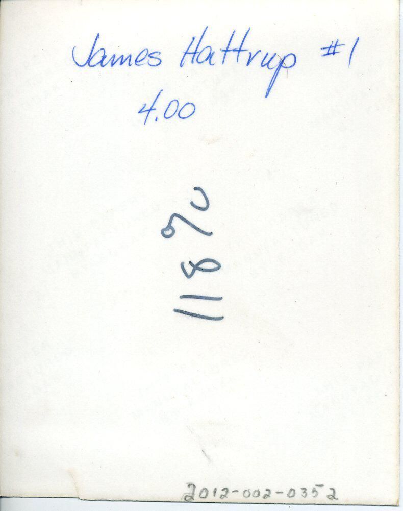 Black and white photo of a smiling James Hattrup. He has dark curly hair and is wearing a checked short-sleeved shirt that is open at the collar revealing a white tee. There is a pocket on the shirt. There is foliage in the background and a white border on all sides. On the back in ink is "James Hattrup #1 4.00" and in felt pen "118%".Made/Created