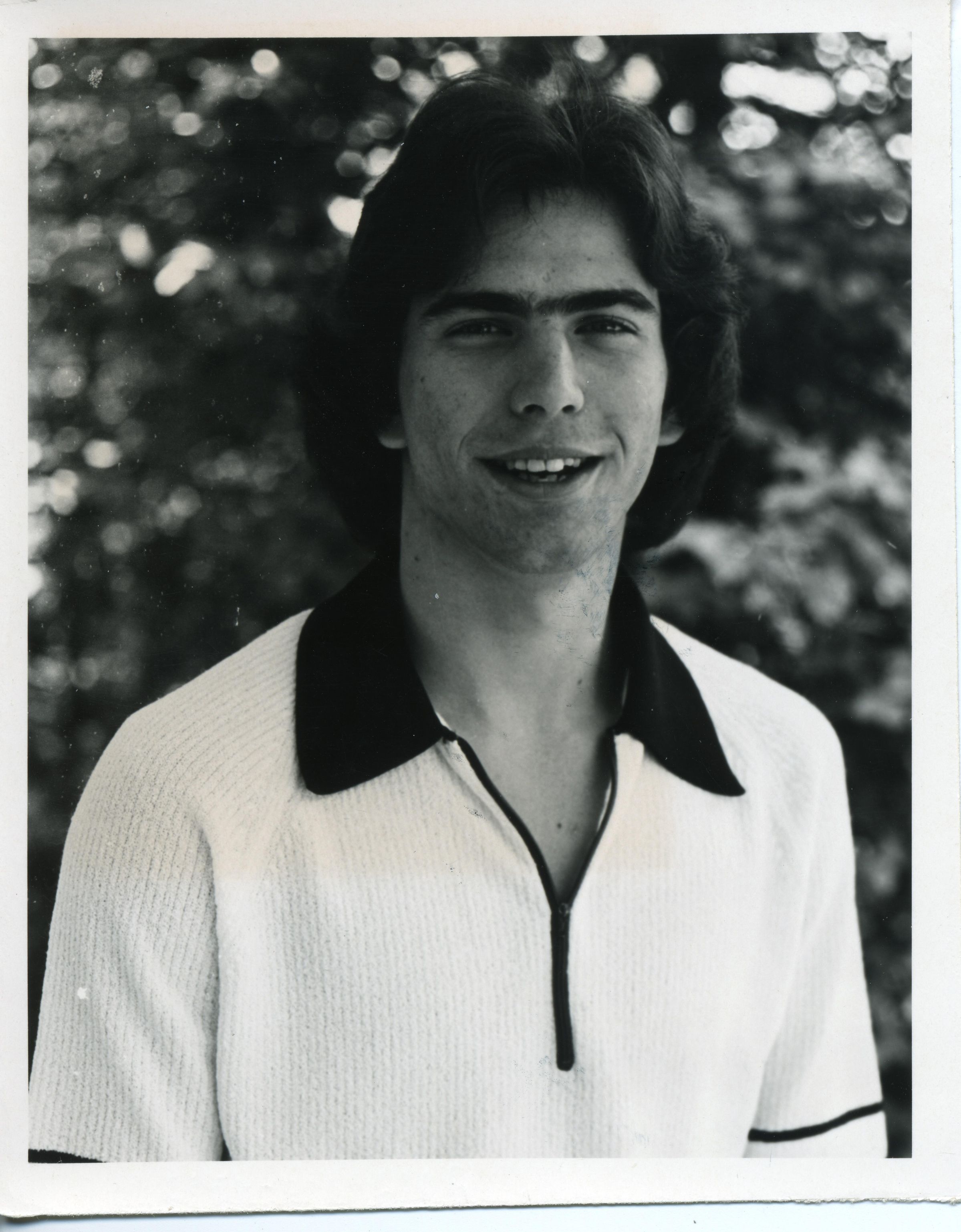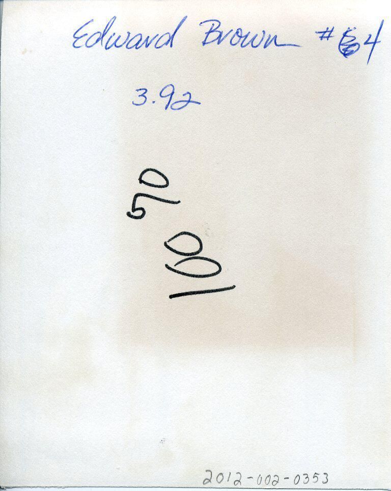 Black and white photo of a smiling Edward Brown. He has long dark hair and is wearing a white shirt with a black collar. The neck has a zipper opening that is partially closed. There is foliage in the background. There is a white border on all sides. On the back in ink is "Edward Brown #64 3.92" and in felt pen is "100%".Made/Created
