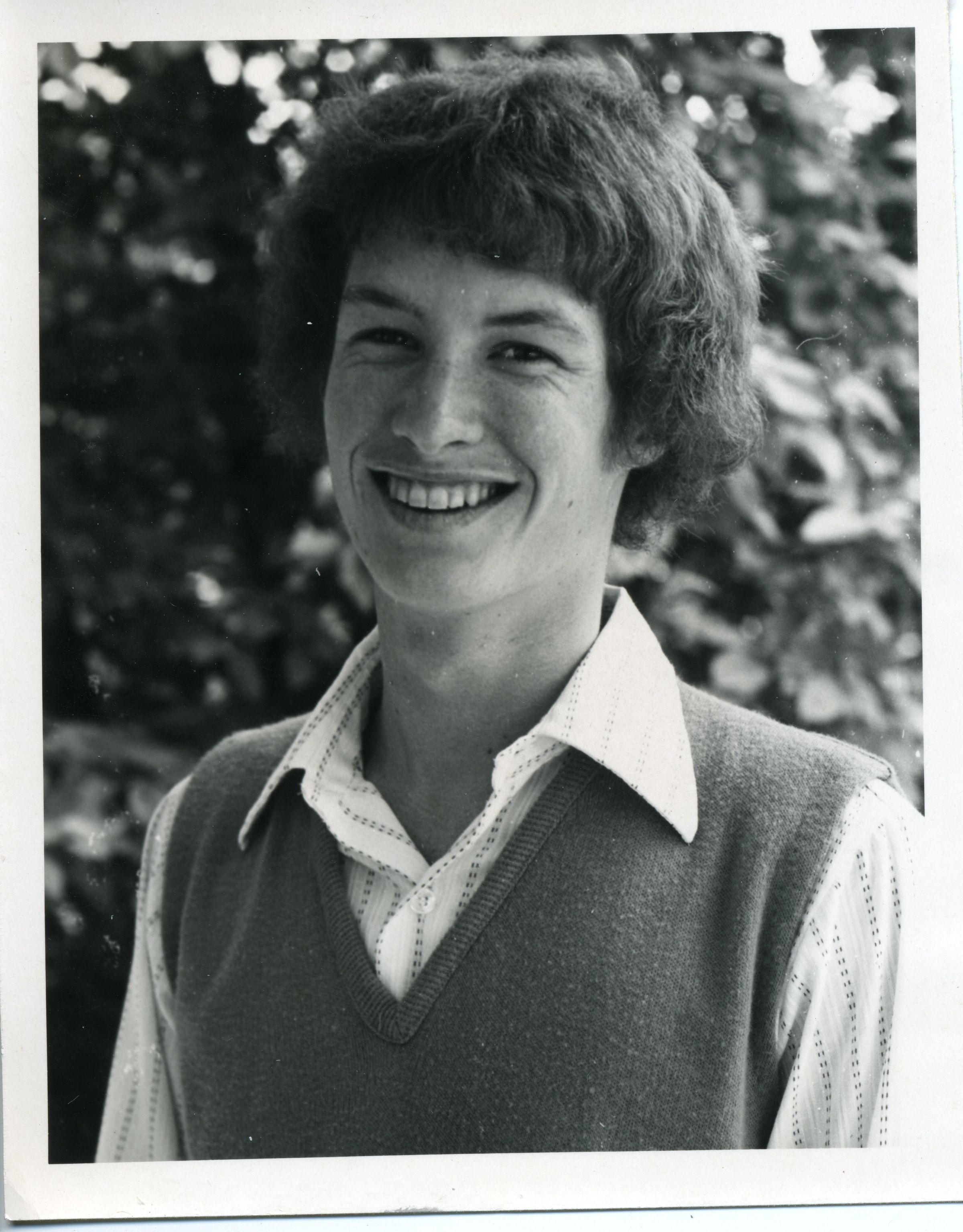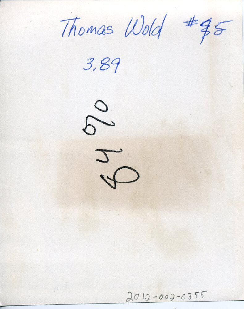 Black and white photo of a smiling Thomas Wold. He has a full head of medium colored and length hair. He has on a sleeveless sweater over a white shirt with a pattern. There is a white border on all sides. There is foliage in the background. On the back in ink is "Thomas Wold #15 3.89" and in felt pen "84%".Made/Created