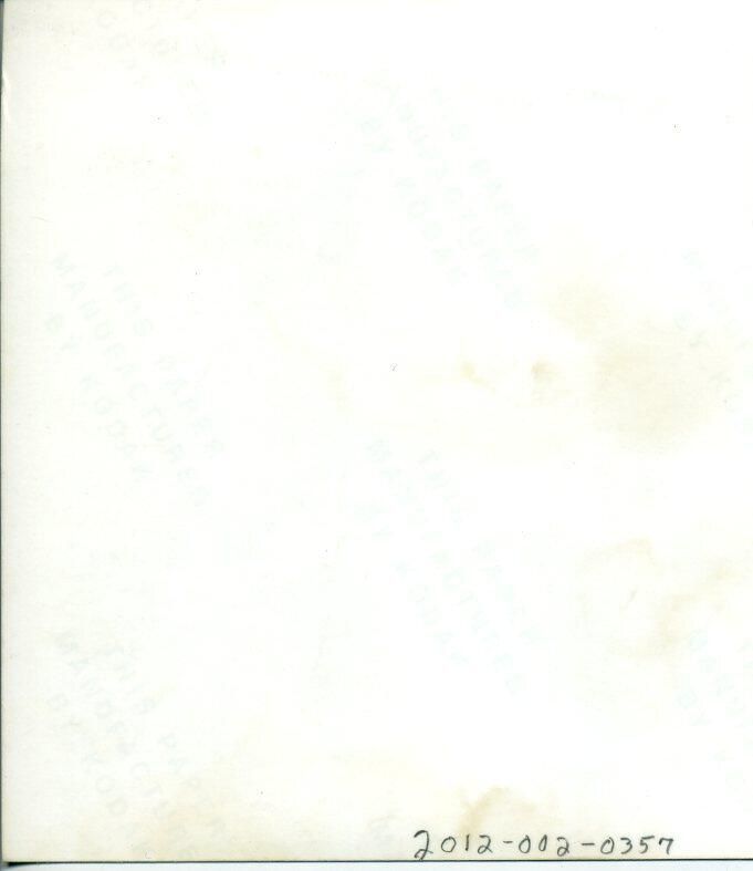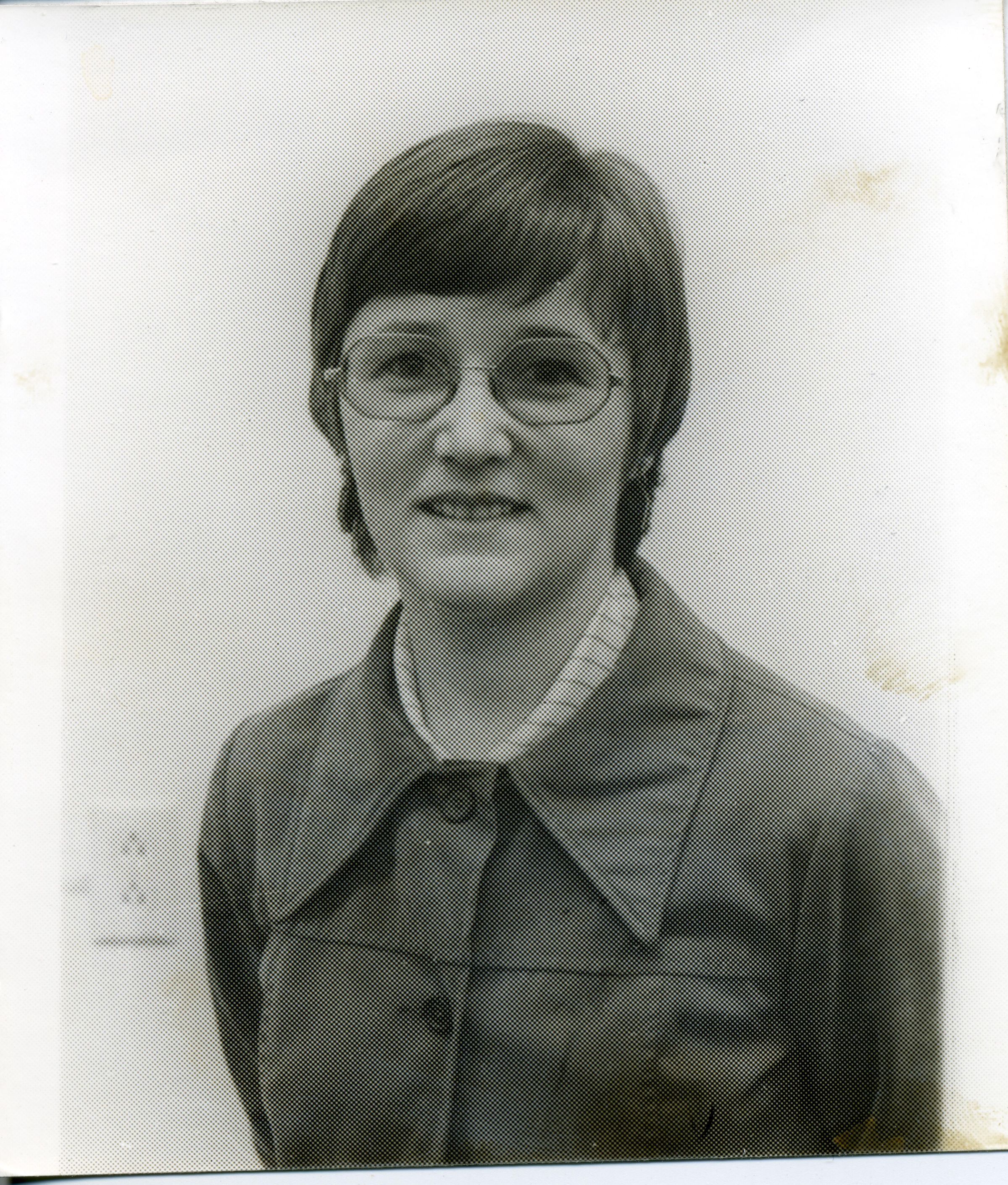Black and white photo of a woman with short dark hair and wearing glasses. She has on a dark dress over a light colored blouse with a check pattern. Buttons are visible on the front of the dress. There is a white border on the sides and the top.. There is no information on the back.Made/Created