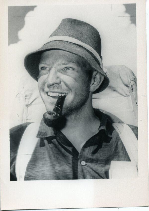 Black and white photo of a man with a hat and holding a pipe in his mouth. He has on a dark shirt open at the collar and with buttons visible on the front. There are straps over his shoulders and part of a back pack visible behind him. There is an image of clouds in the background. There is a white border on all sides. On the back in ink is "150%".Made/Created