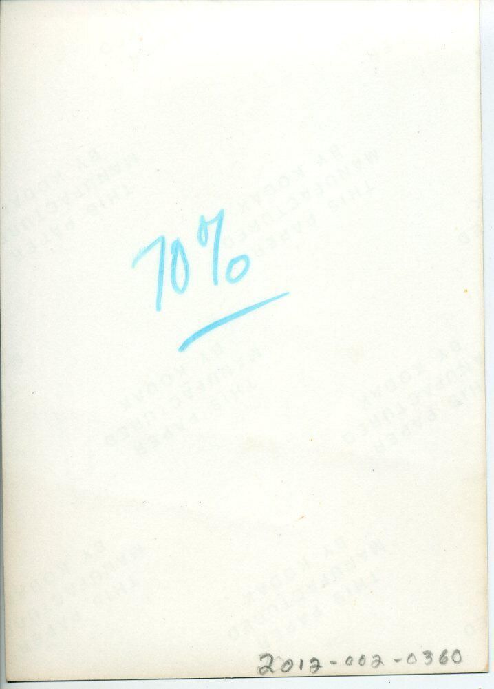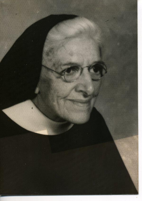 Black and white photo of a woman in a Nun's gown and headware. She has on glasses and has gray hair. There is no border. On the back in blue felt pen is "70%".Made/Created