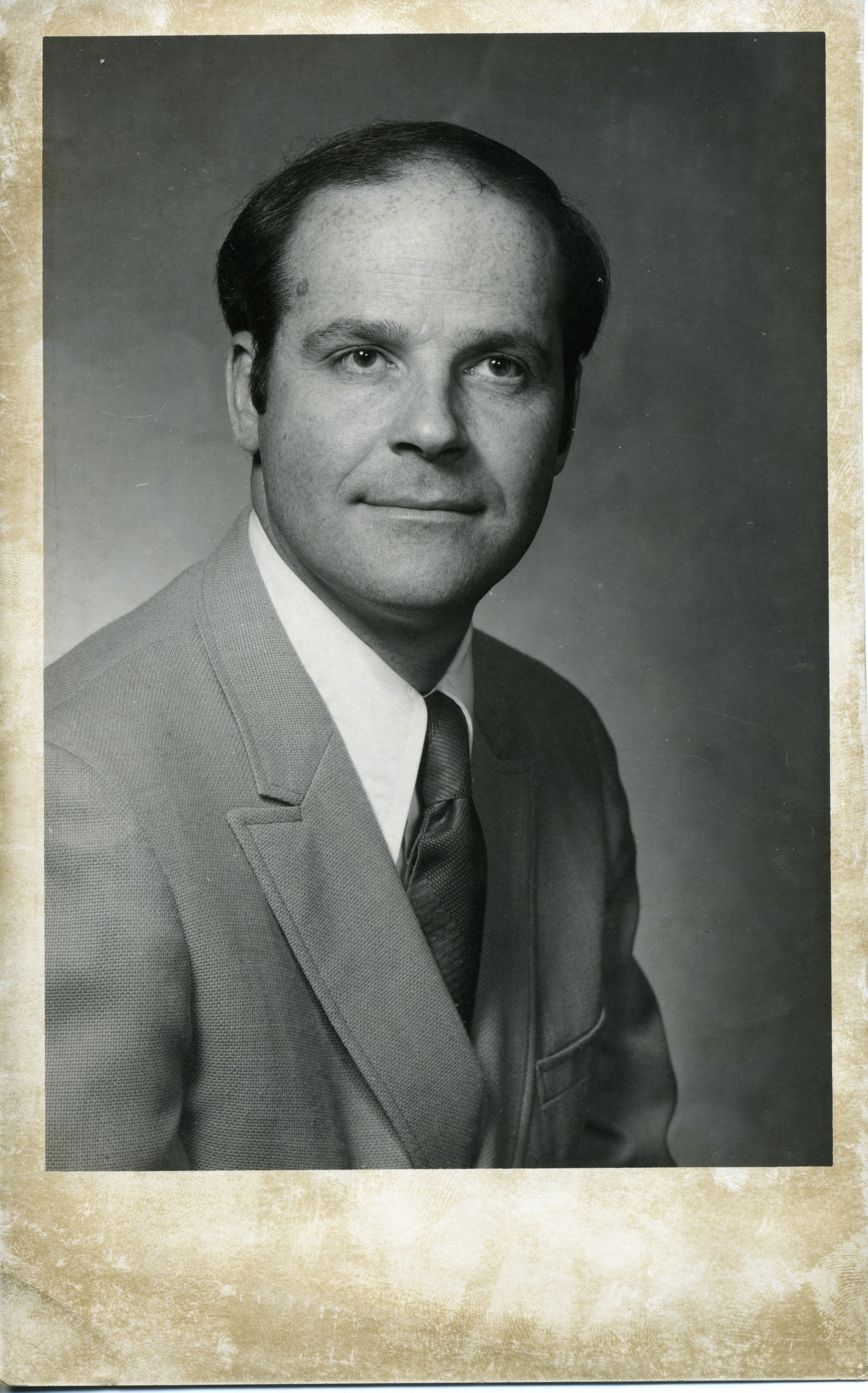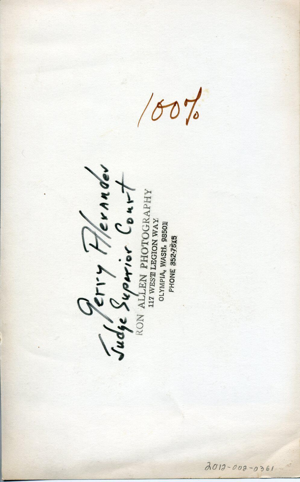 Black and white photo of Gerry Alexander. He has short dark hair and is wearing a light colored suit over a white shirt and a dark tie. There is a white border on all sides with the bottom border being larger. On the back in black felt pen is "Gerry Alexander Judge Superior Court" and in red felt pen is "100%". A stamp in black ink says "Ron Allen Photography 117 West Legion Way Olympia, Wash 98501 Phone 352-7515".