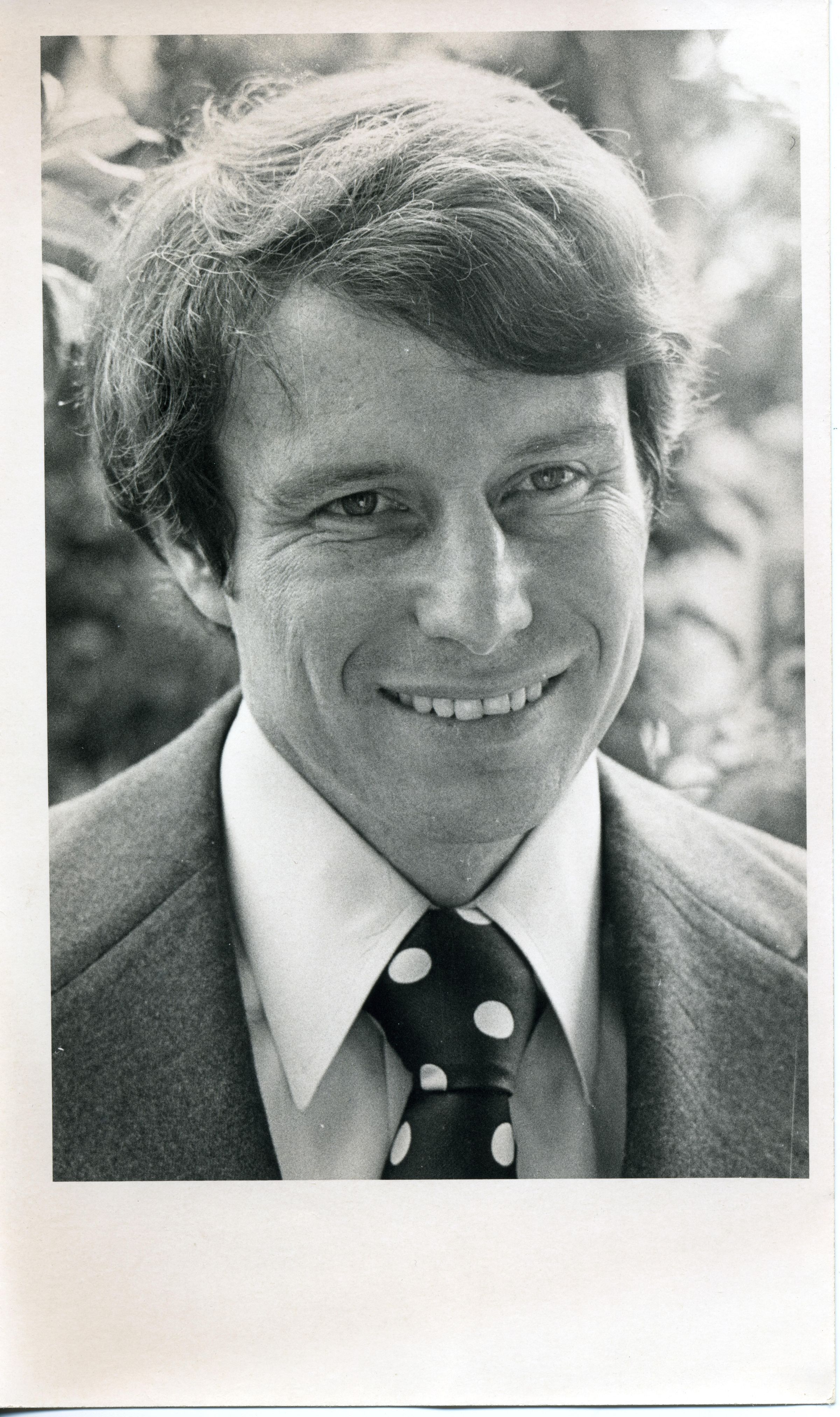 Black and white photo of a smiling Don Bonker. He has medium length hair and is wearing a light colored suit over a white shirt and polka dot tie. In the background is foliage. There is a white border on all sides with the bottom border being larger. On the back in pencil is "Don Bonker".