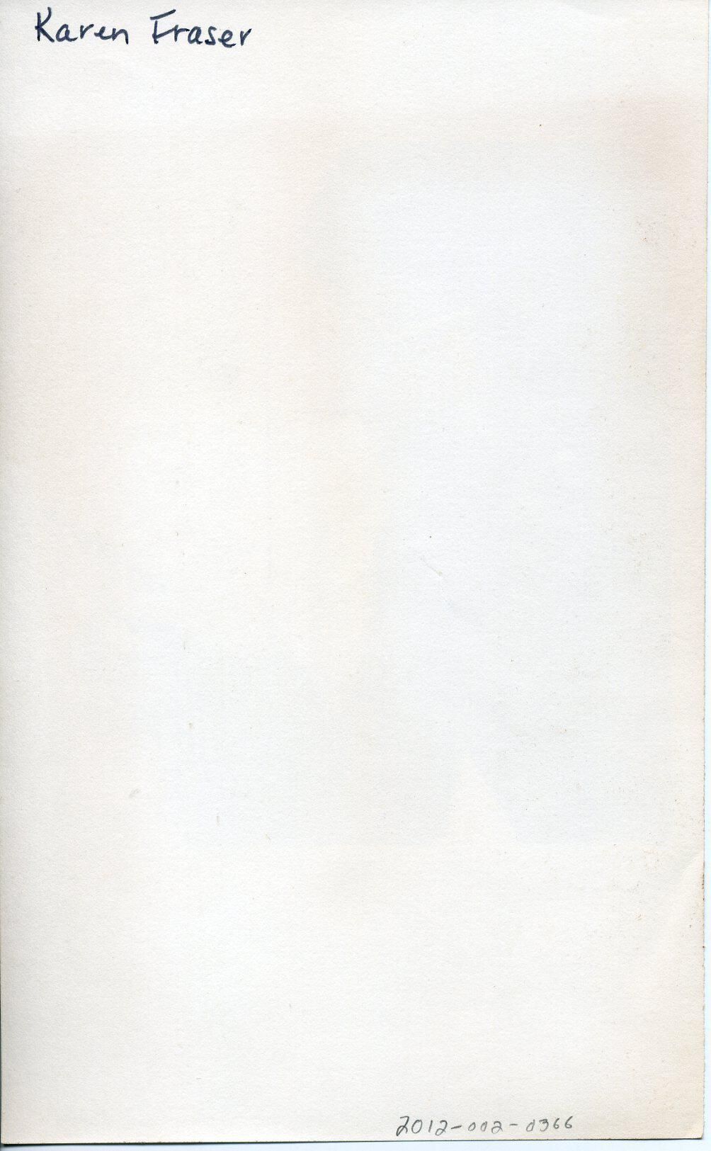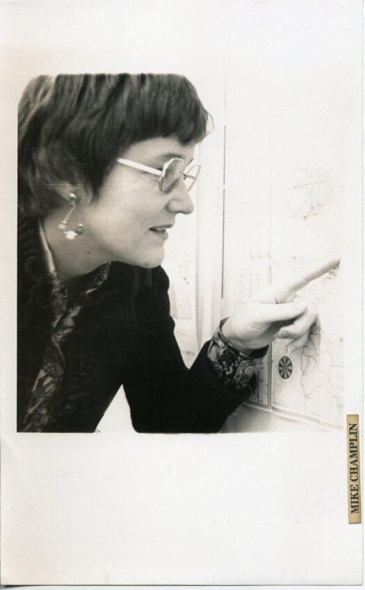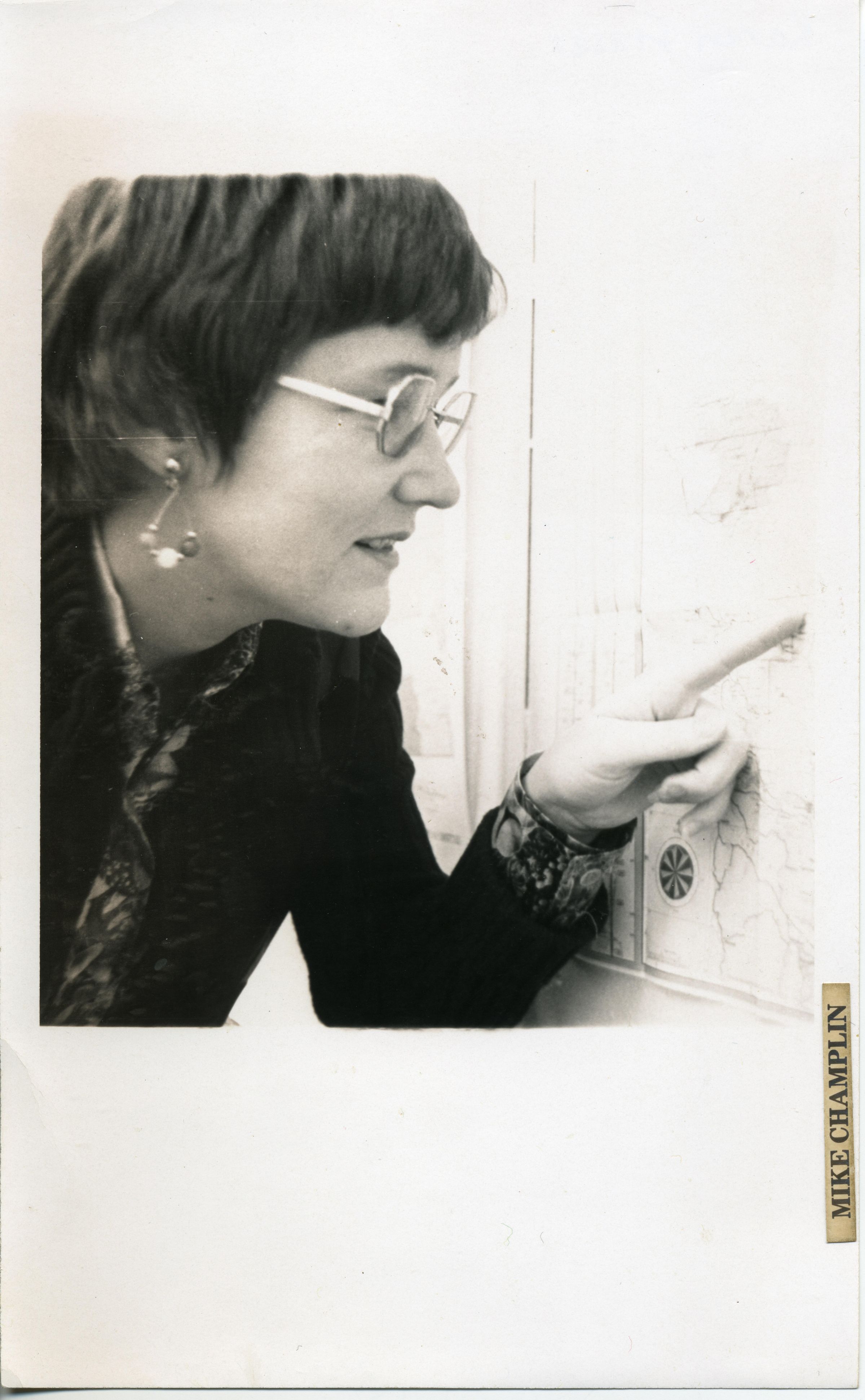 Black and white photo of Karen Fraser. She has short dark hair and is wearing glasses. She has on a dark dress over a patterned blouse. She is wearing ear rings. The photo is a profile with her looking at and pointing at a map. There is a white border on all sides with the top and bottom border being larger. On the back in ink is "Karen Fraser".