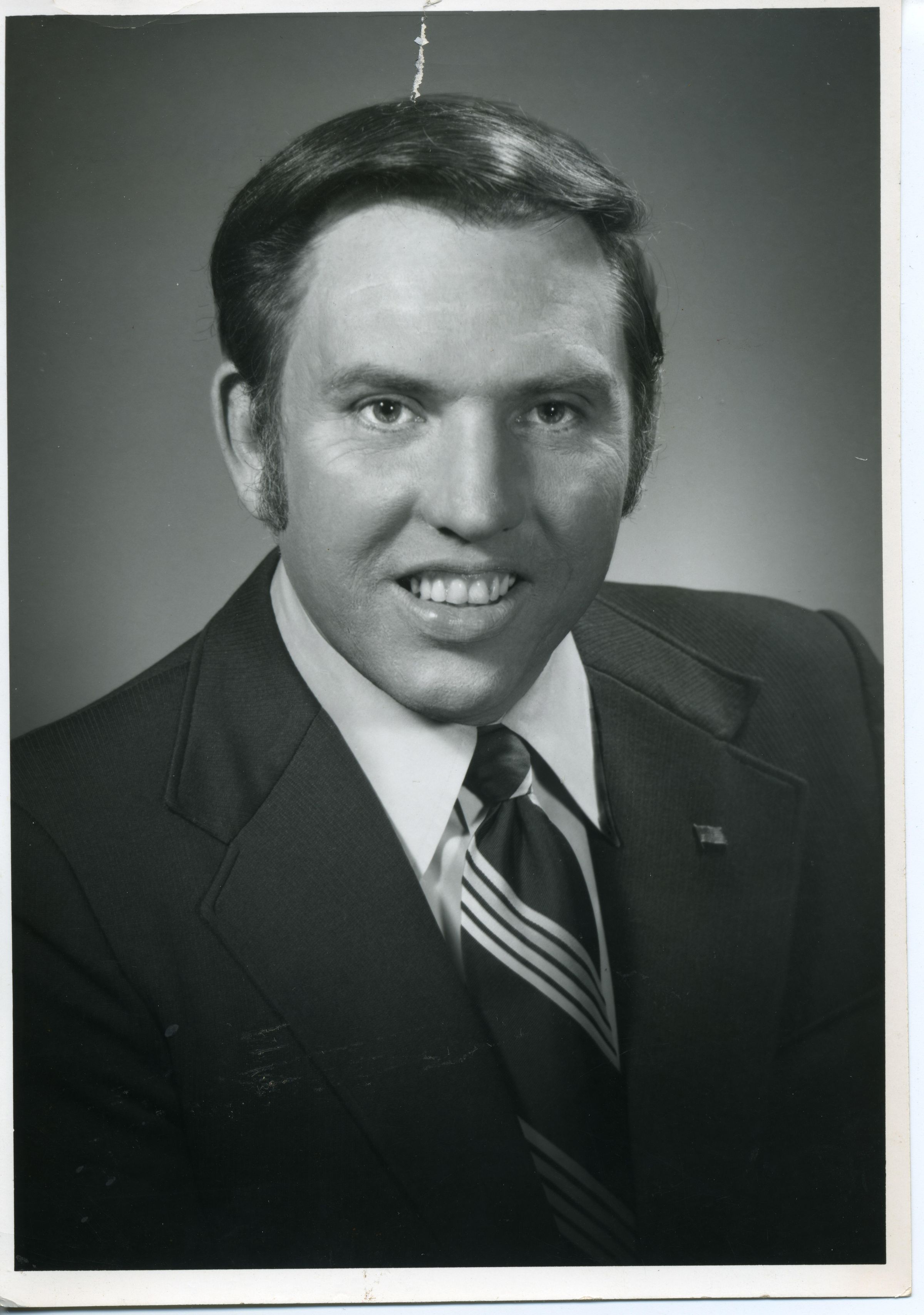 Black and white photo of Ken Johnston. He has short dark hair and is wearing a dark suit over a white shirt and a patterned tie There is a membership-type pin in his lapel. There is a white border on all sides. On the back in felt pen is "Ken Johnston Pierce County Assessor 1973" and a red stamp that says "Foshaug Studio 120 W. Main Puyallup, Wash. (near the theatre} Phone Thornwall 5-2107".