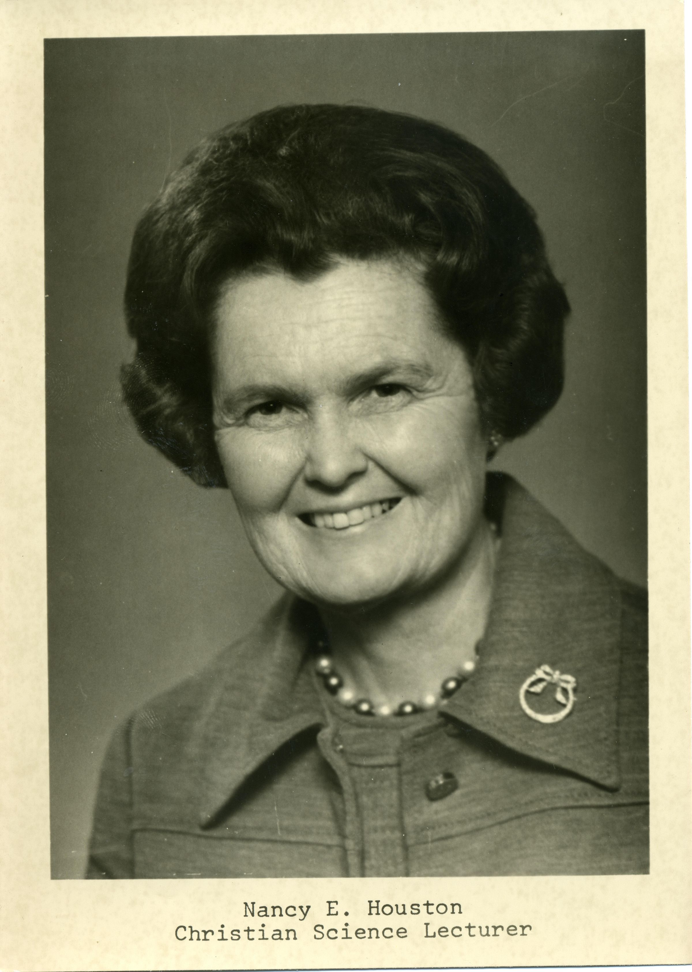 Black and white photo of a smiling Nancy E. Houston. She has medium length dark hair and is wearing a medium dark dress with a button visible and an emblem on the collar. She is also wearing a bead necklace. There is a white border on all sides and on the bottom border is typed "Nancy E. Houston Christian Science Lecturer". On the back in ink is "46%".Made/Created