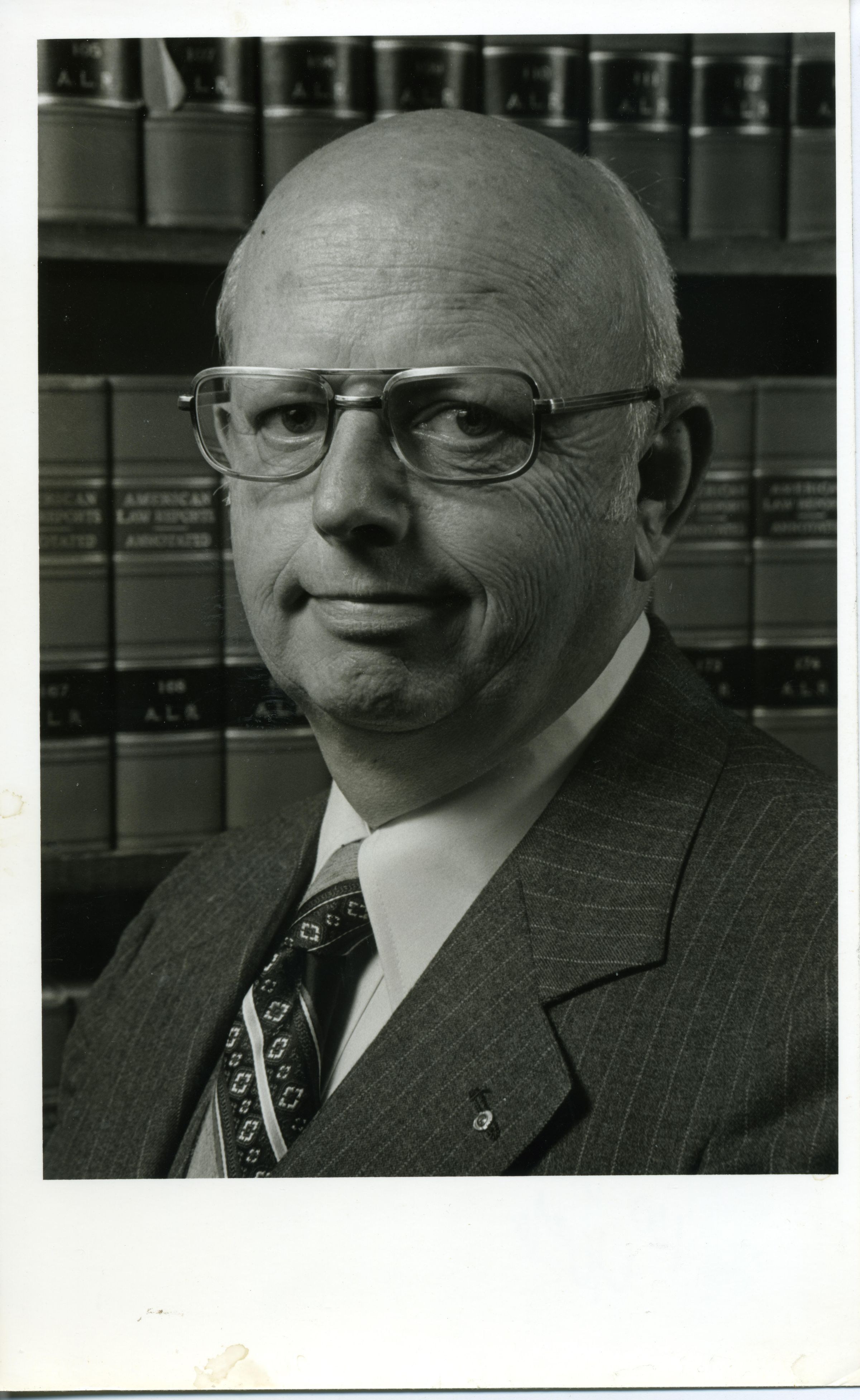 Black and white photo of Bob Lundgaard. He is mostly bald and is wearing glasses. He has on a pin-striped suit over a white shirt and a patterned tie. Behind him are shelves of law books. There is a white border on all sides with the bottom border being larger. On the back in ink is "Bob Lundgaard" and in pencil "100 line 40%" and in green ink a "G" with a circle around it.Made/Created