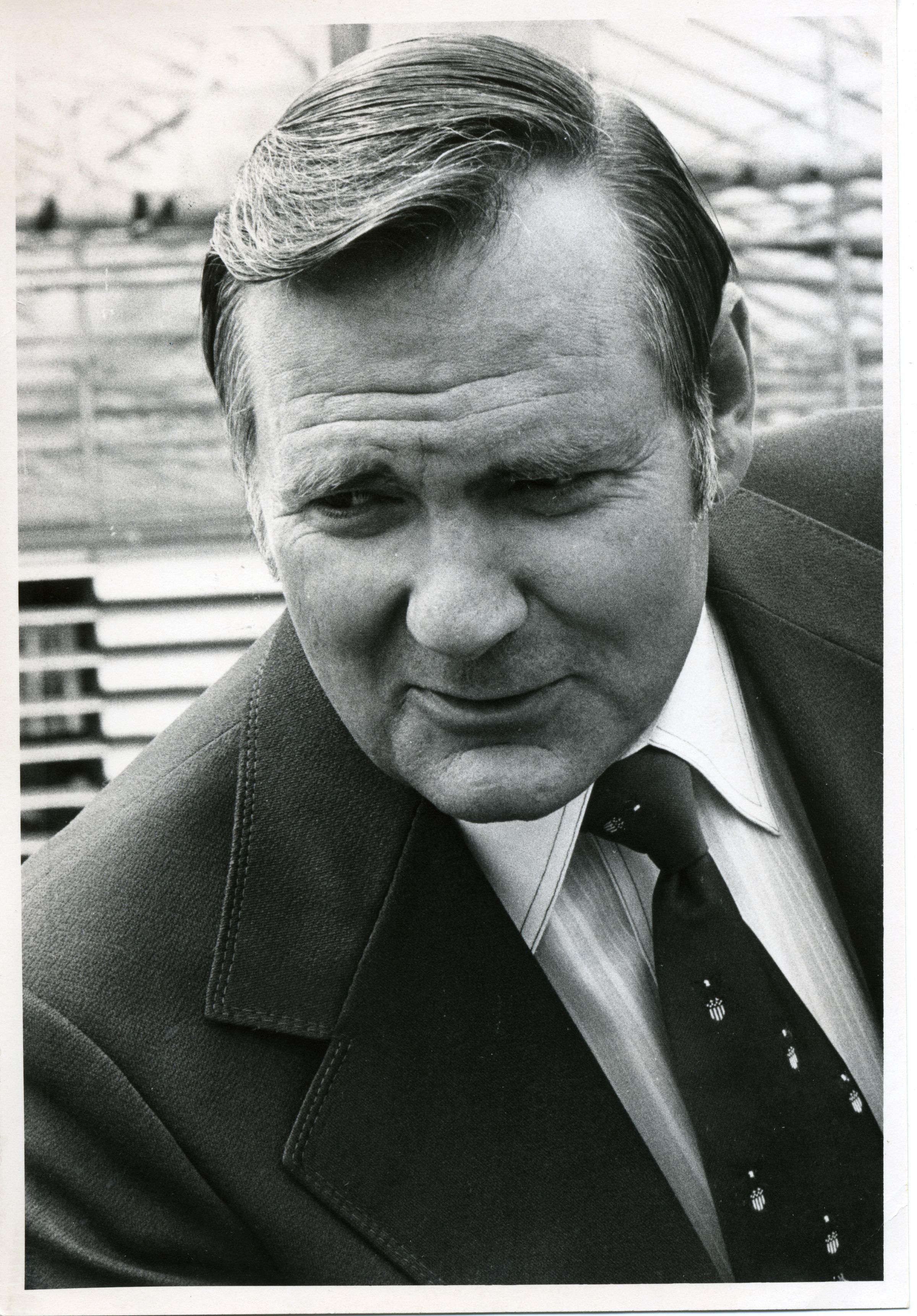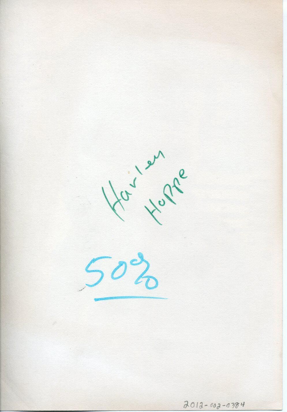 Black and white photo of Harley Hoppe. He has short medium dark hair and is wearing a dark suit over a white shirt with stripes and a tie with shield emblems on it. He is looking down, and a portion of a building is in the background. There is a white border on all sides. On the back in green ink is "Harley Hoppe" and in blue felt pen is "50%".