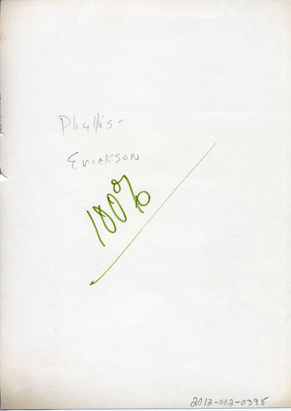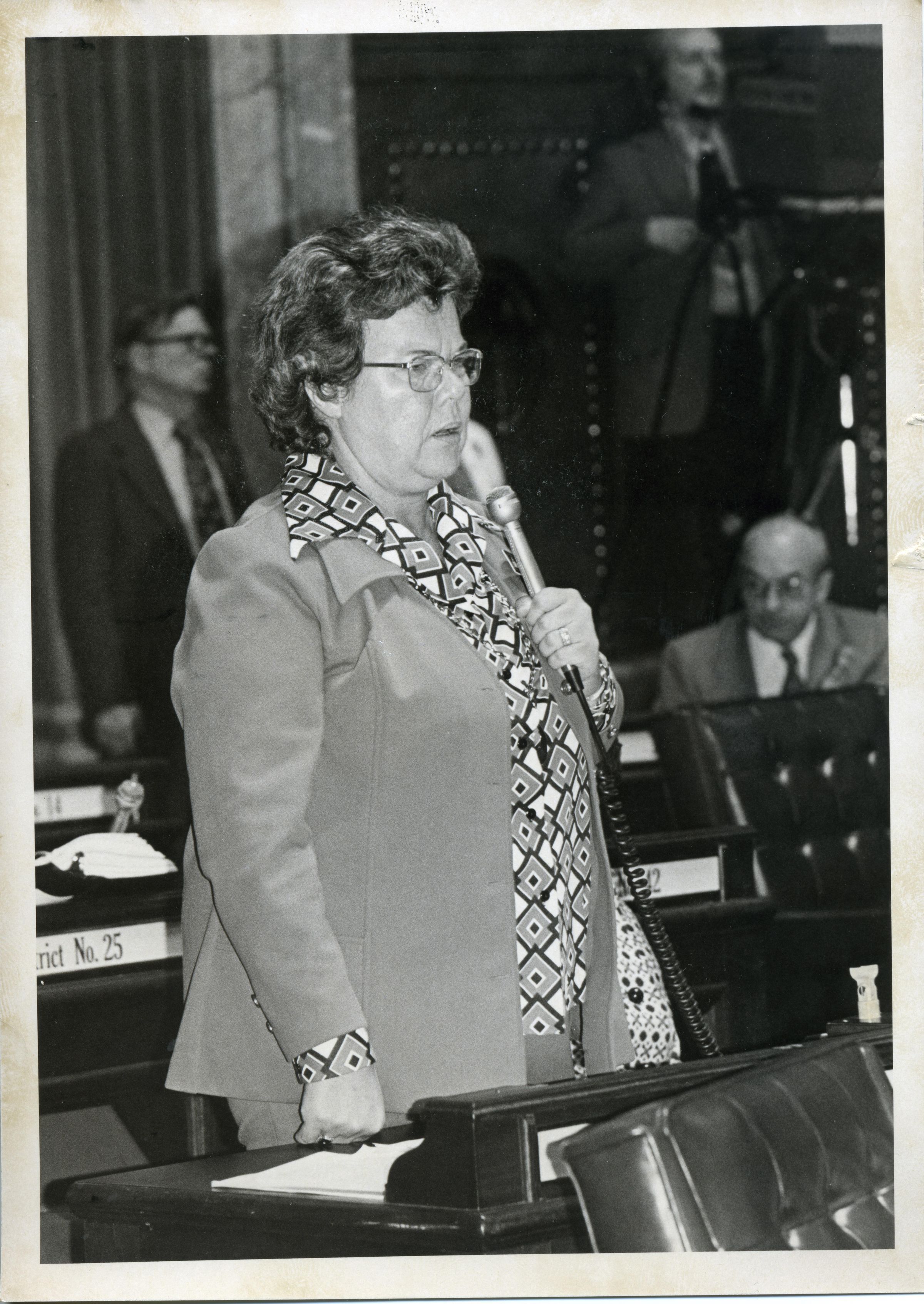 Black and white photo of Phyllis Erickson. She has dark hair and is wearing glasses. She has on a light-colored jacket over a check-patterned blouse. She is standing and holding a microphone in the midst of desks and chairs that is presumably a House or Senate chamber. Three individuals are visible in the background. There is a white border on all sides. On the back in green ink is "100%" and in pencil "Phyllis Erickson".