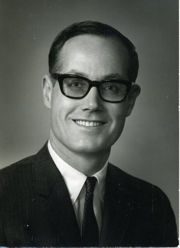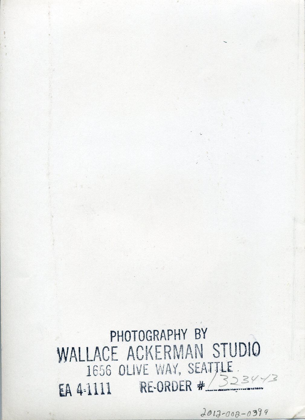 Black and white photo of a smiling Slade Gorton. He has short dark hair and is wearing glasses. He has on a dark suit over a white shirt and dark tie. There is no border. On the back is a stamp in black ink that says "Photography by Wallace Ackerman Studio 1656 Olive Way, Seattle EA 41111 Re-order # [in pencil] 1323443"