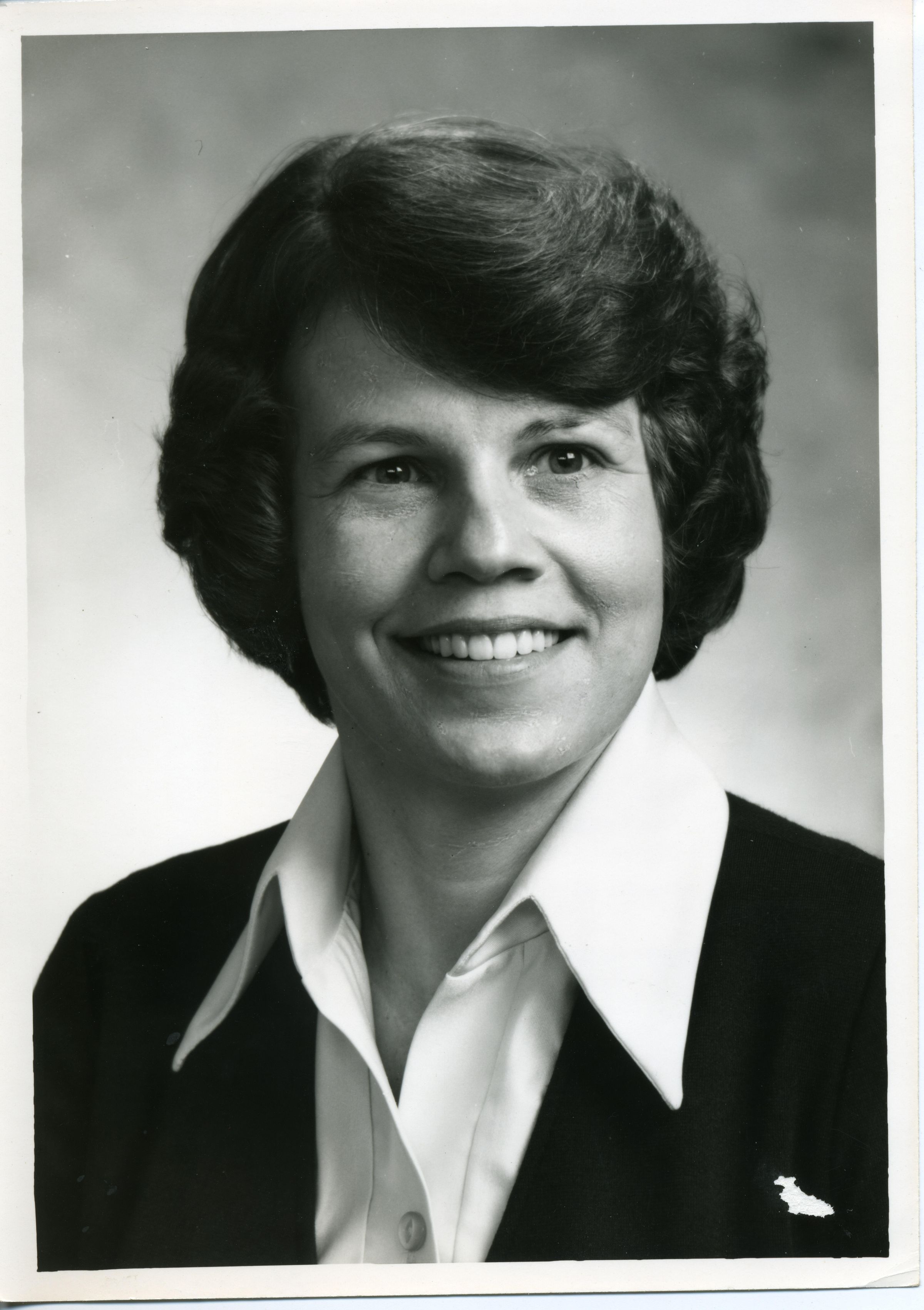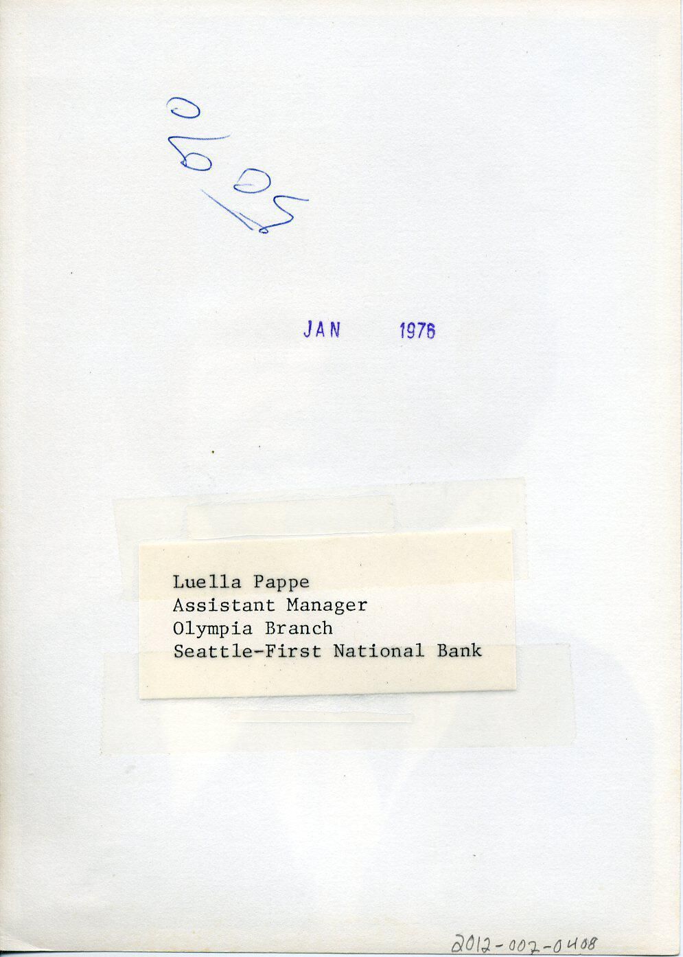 Black and white photo of a smiling Luella Pappe. She has medium length dark hair and is wearing a dark jacket over a white blouse open at the collar. A button is visible on the blouse. There is a white border on all sides. There is an emulsion flaw near the bottom right corner. On the back in ink is "50%" and a stamp that says "Jan 1976". On a pasted-on piece of paper is typed "Luella Pappe Assistant Manager Olympia Branch Seattle-First National Bank".