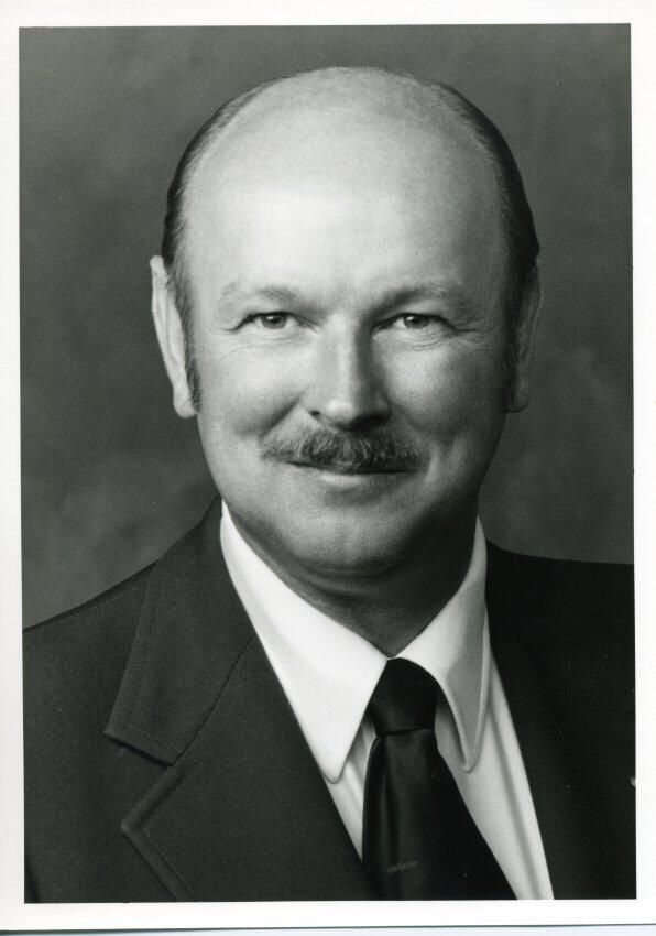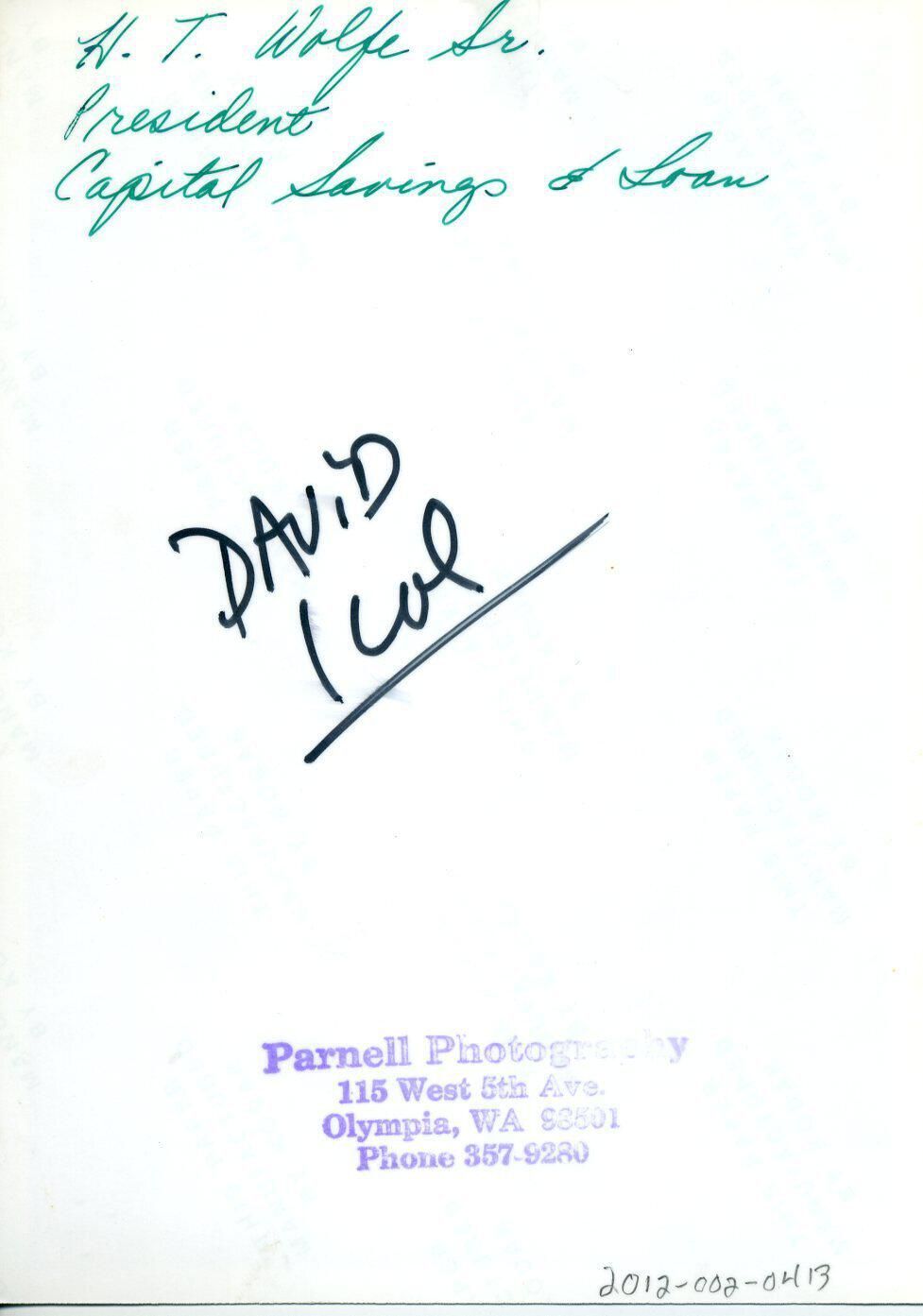 Black and white photo of H. T. (Hal) Wolfe Sr. He is mostly bald and has a small mustache. He is wearing a dark suit over a white shirt and a dark tie. There is a white border on all sides. On the back in green ink is "H. T. Wolfe Sr. President Capital Savings & Loan". In black felt pen is "David 1 col" and in purple ink is stamped "Parnell Photography 115 West 5th Ave. Olympia, WA 98501 Phone 357-92380".