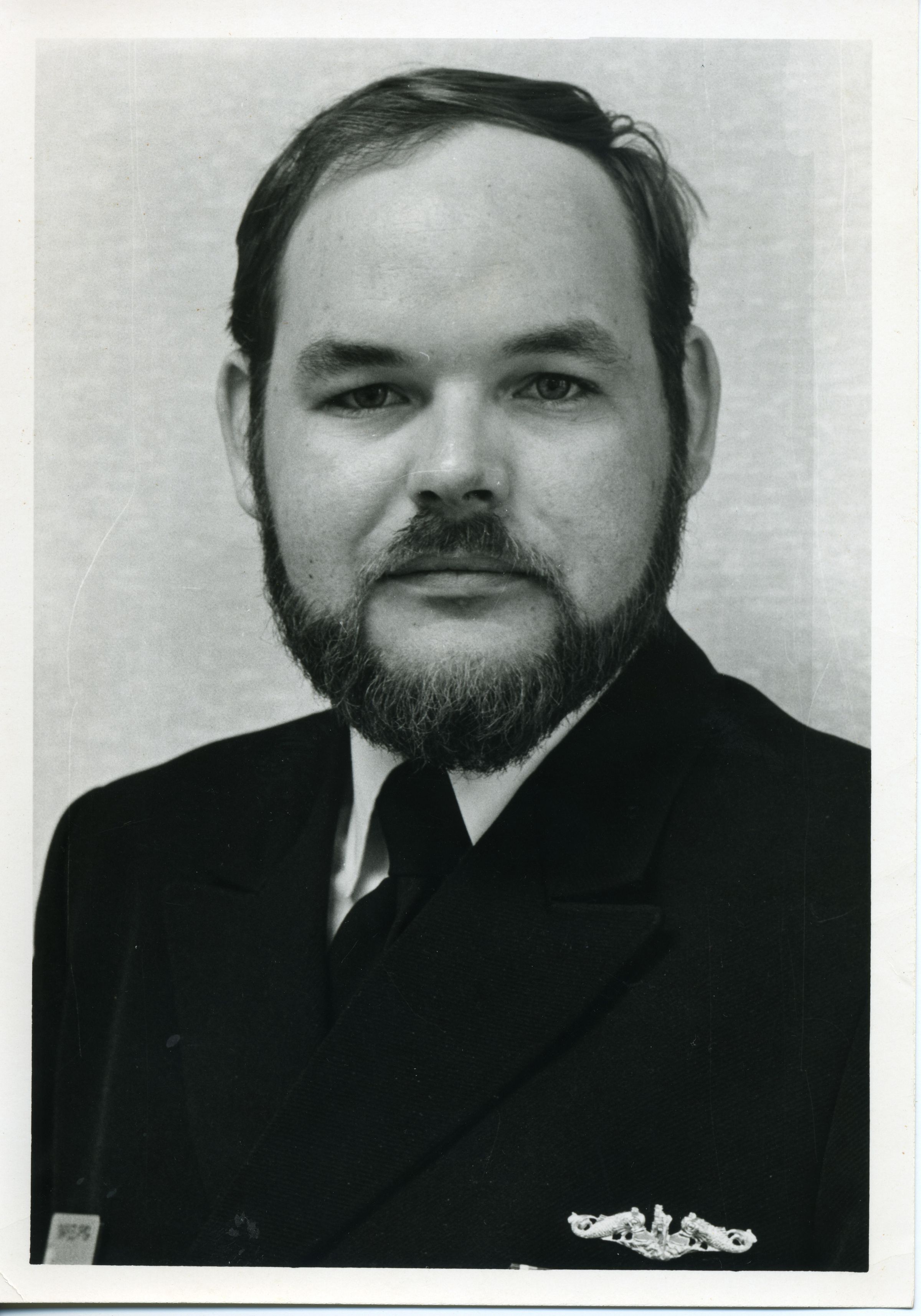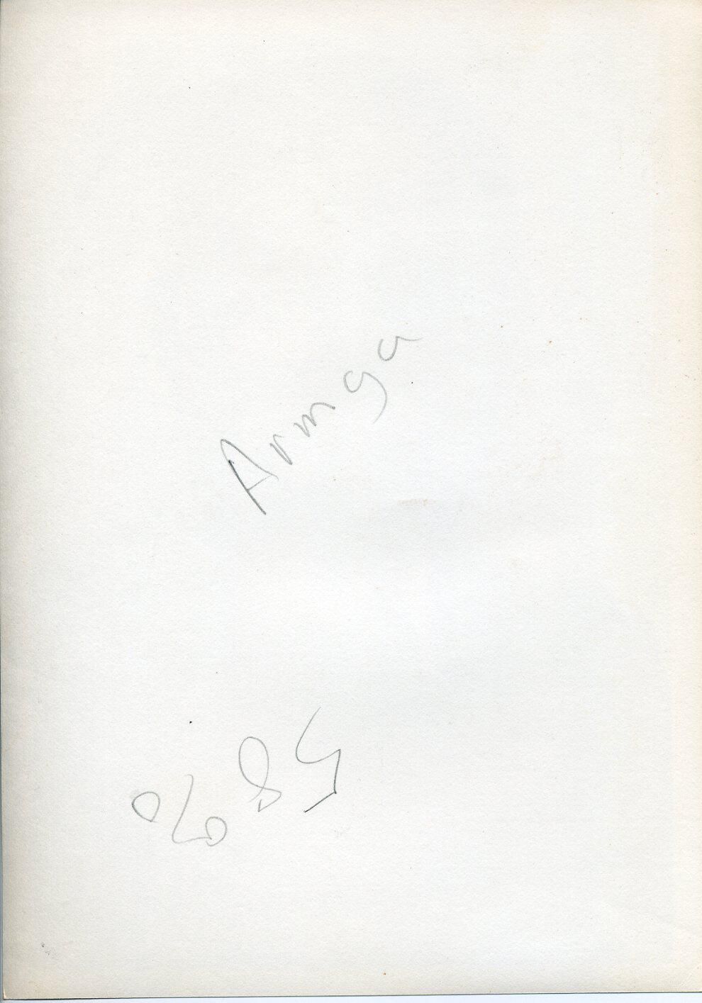 Black and white photo of a man identified only as "Armga". He has dark hair and a full beard and mustache. He is wearing a dark suit over a whie shirt and dark tie. On the suit coat is a set of military wings such as a submariner would wear. In the bottom left corner of the image is a white square that has printed on it "WE" or"WZ" and what appears to be a number. There is a white border on all sides. On the back in pencil is "Armga" and "58%".
