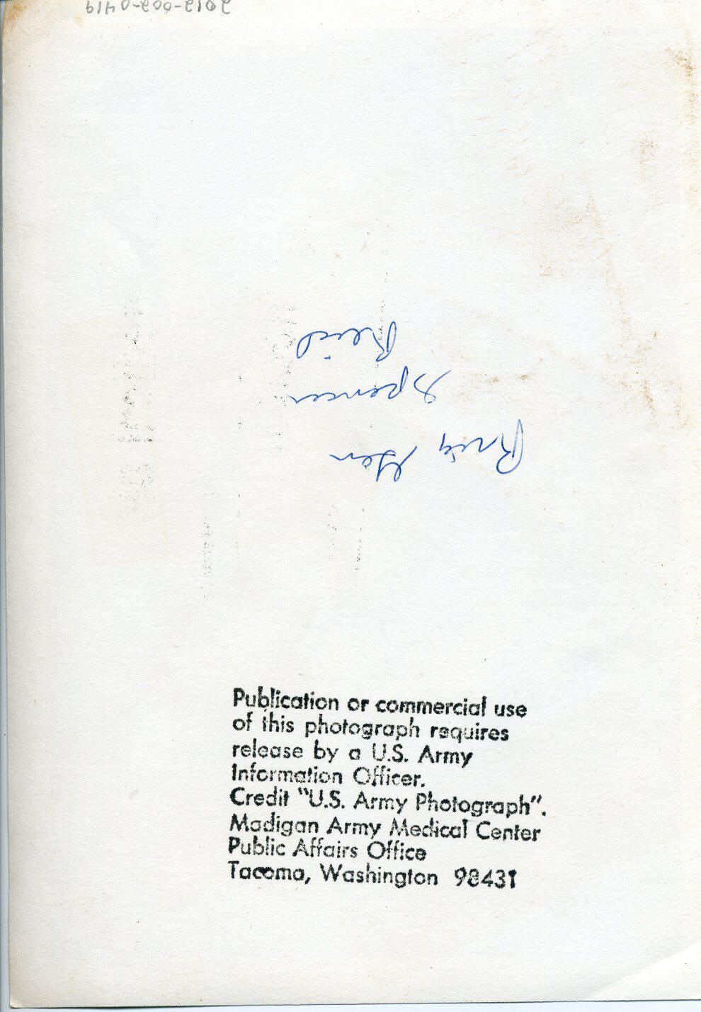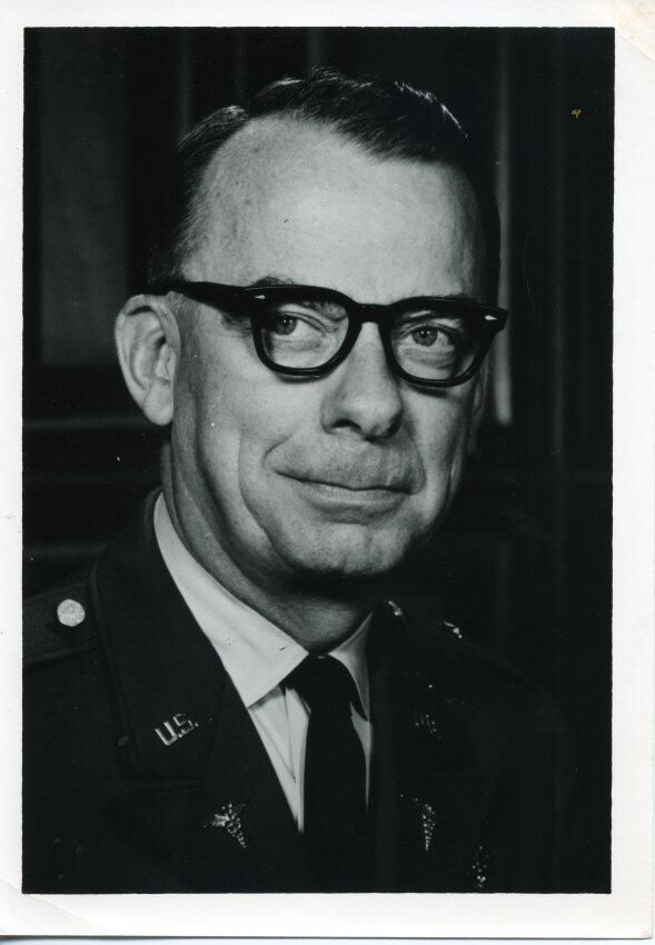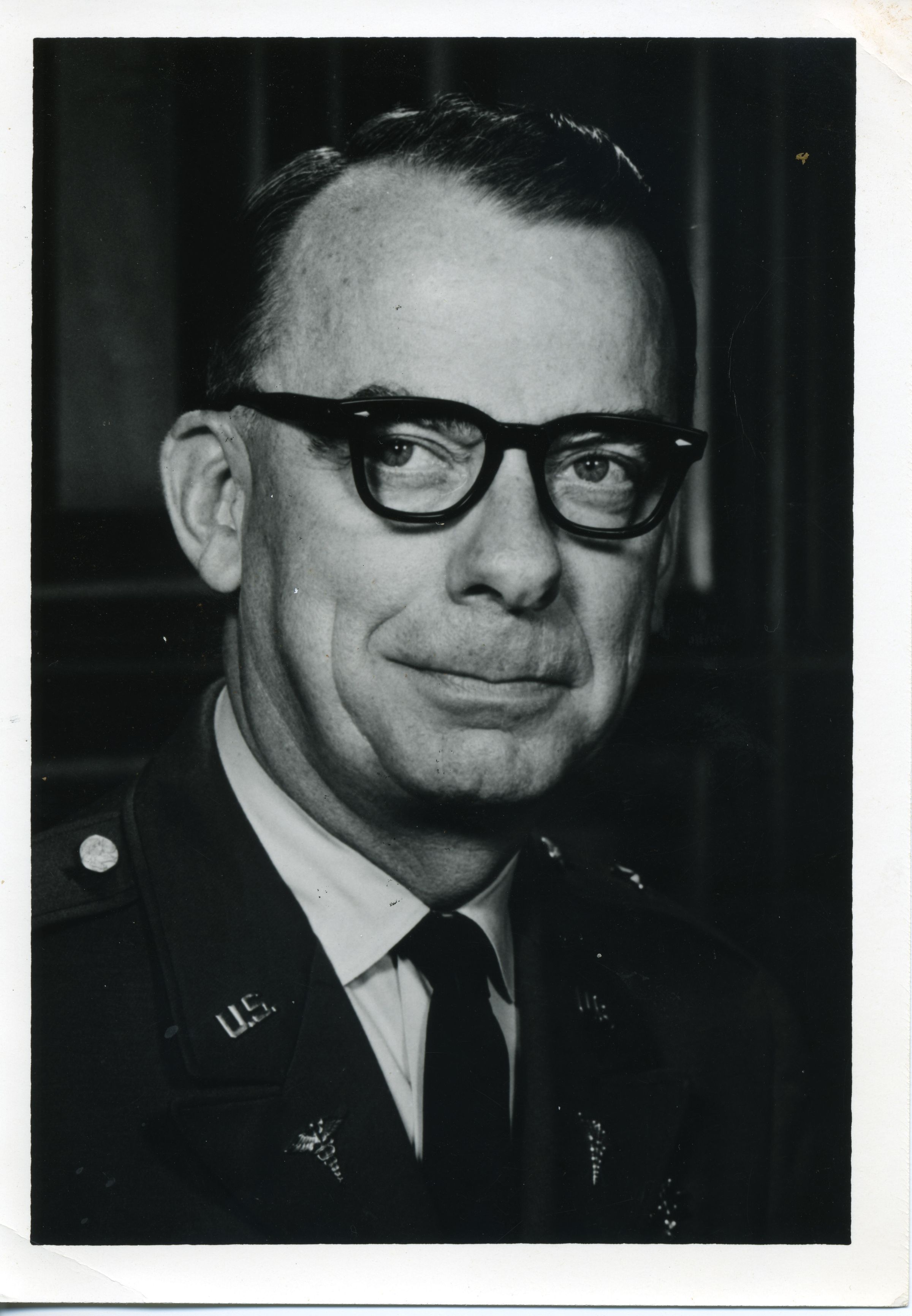 Black and white photo of Spencer Reid. He has short dark hair and is wearing glasses and a military uniform over a white shirt and dark tie. On the uniform a button is visible as are pins saying "U. S." and the medical core of the army. He is listed as a Brigadier General. There is a white border on all sides. On the back in ink is "Brig Gen Spencer Reid" and a stamp in black ink says "Publication or commercial use of this photograph requires release by a U.S. Army Information Officer. Credit 'U.S. Army Photograph' Madigan Army Medical Center Public Affairs Office Tacoma, Washington 98431".Made/Created