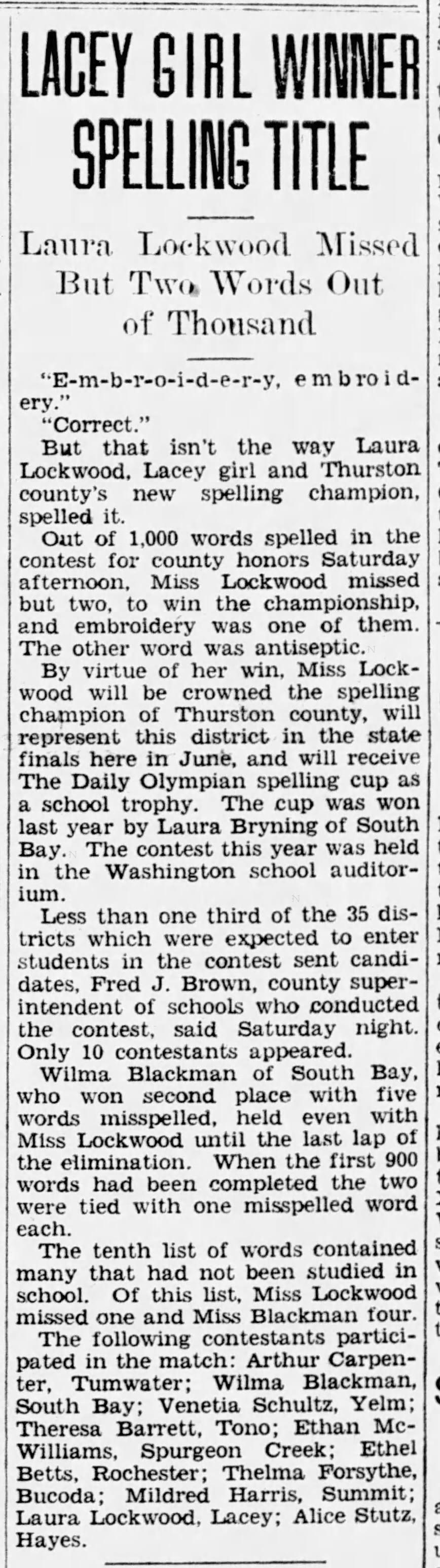 Trophy presented by Morning Olympian to Thurston County School with Champion Speller each year. Gertrude Corrie, Gull Harbor, 1924. Nettie Schultz, Collins, 1925. Helen Coppersmith, Collins, 1926. John Lockwood, Lacey, 1927. Dorris L. Fleureaux, South Bay 1928. Lora Bryning, South Bay, 1929. Laura Lockwood, Lacey, 1930. Bryning went on to win the state championship in 1929.