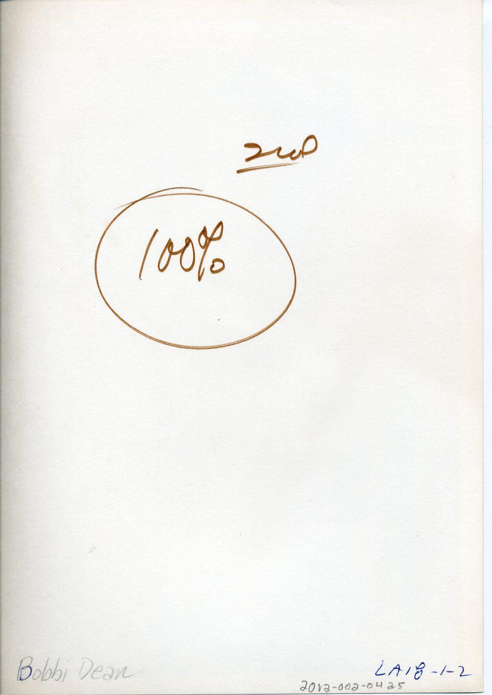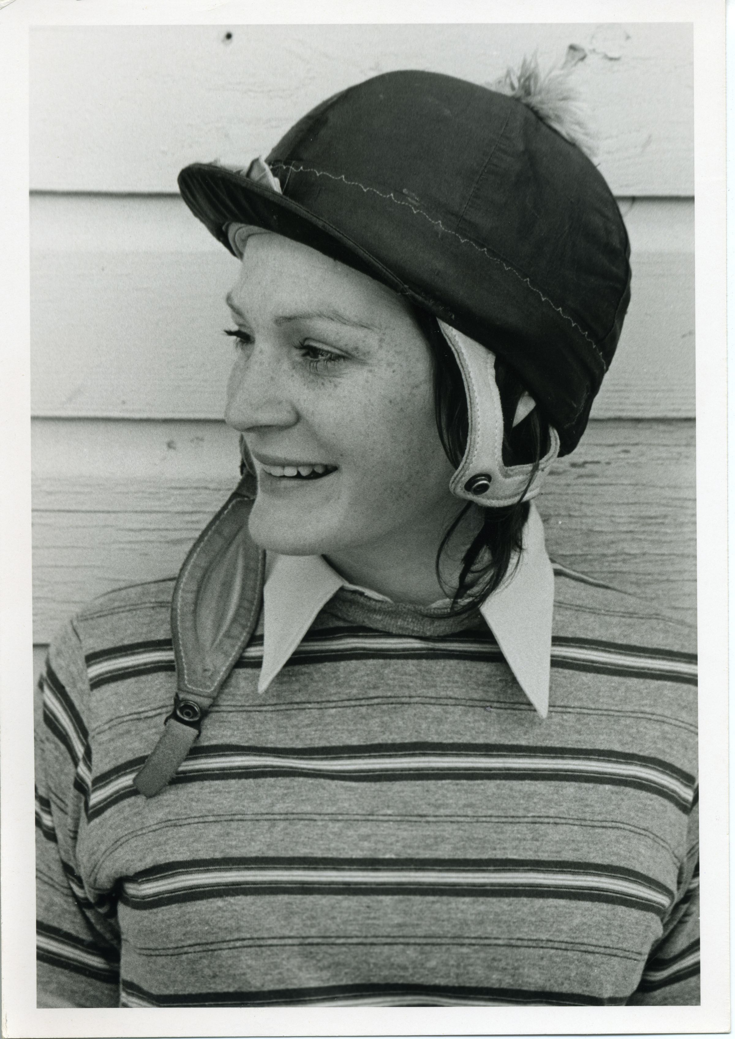 Black and white photo of a smiling Bobbi Dean. She has on an equine-type helmet and is wearing a striped polo shirt over a white shirt of which only the collar is visible. The siding of a building is visible in the background. There is a white border on all sides. On the back in red ink is "2nd" and "100% [in a circle". In pencil is "Bobbi Dean" and in blue ink is "LA18-1-2".