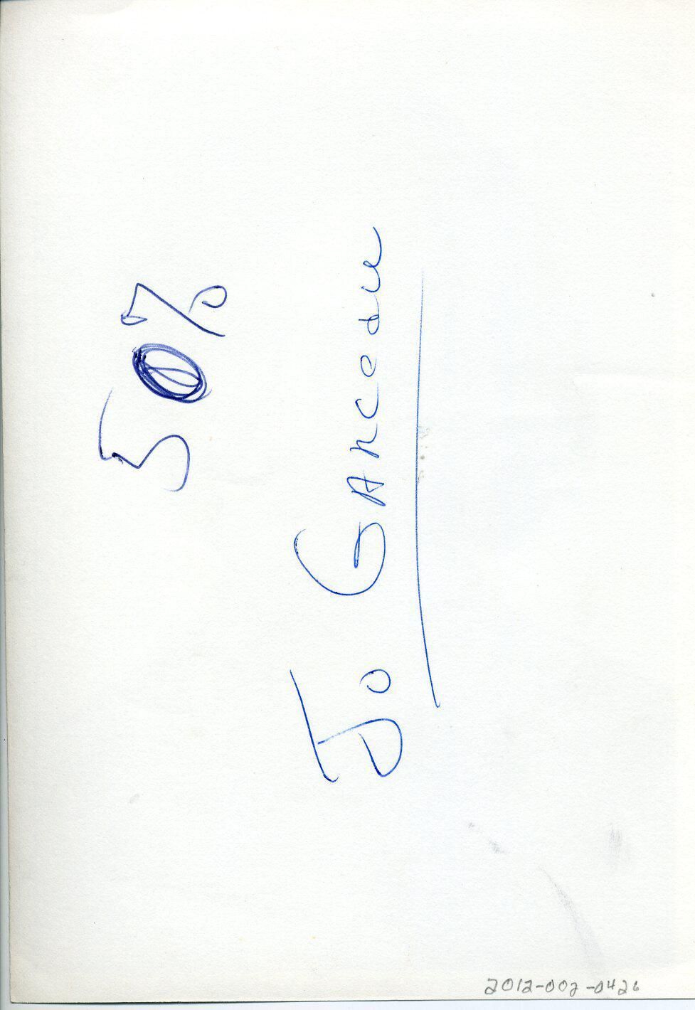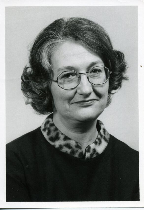 Black and white photo of Jo Gancedie. She has medium length dark hair and is wearing glasses. She has on a dark dress with a leopard-patterned collar. There is a white border on all sides. On the back in blue ink is "50% Jo Gancedie".