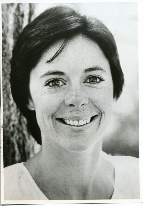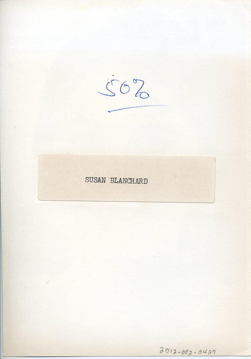 Black and white photo of a smiling Susan Blanchard. She has short dark hair and is wearing a white shirt with a V-neckline. There is what appears to be a tree trunk in the background. There is a white border on all sides. On the back in blue ink is "50%' and on a pasted-on piece of paper is typed "Susan Blanchard".