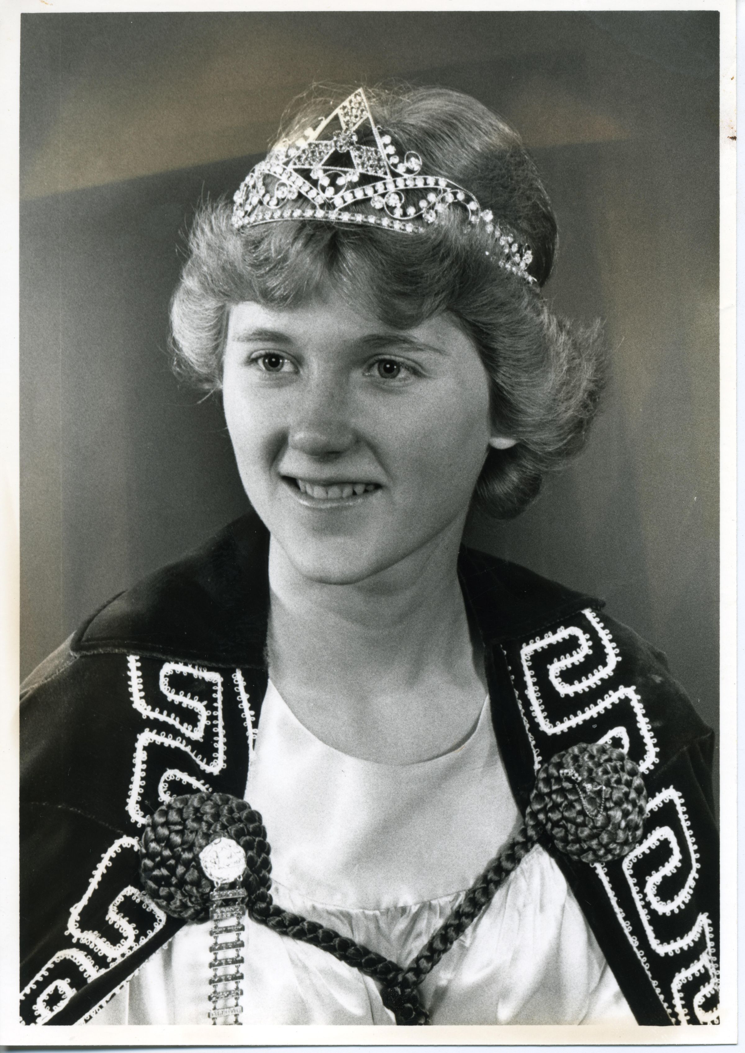 Black and white photo of a smiling girl wearing garments suggesting that she is a member of a school court. She has medium short hair and is wearing a tiara and a robe or cape with decorations that is tied with a cord over a white dress. There is a white border on all sides. The back is blank except for a very light repeated statement that says "This paper manufactured by Kodak".Made/Created