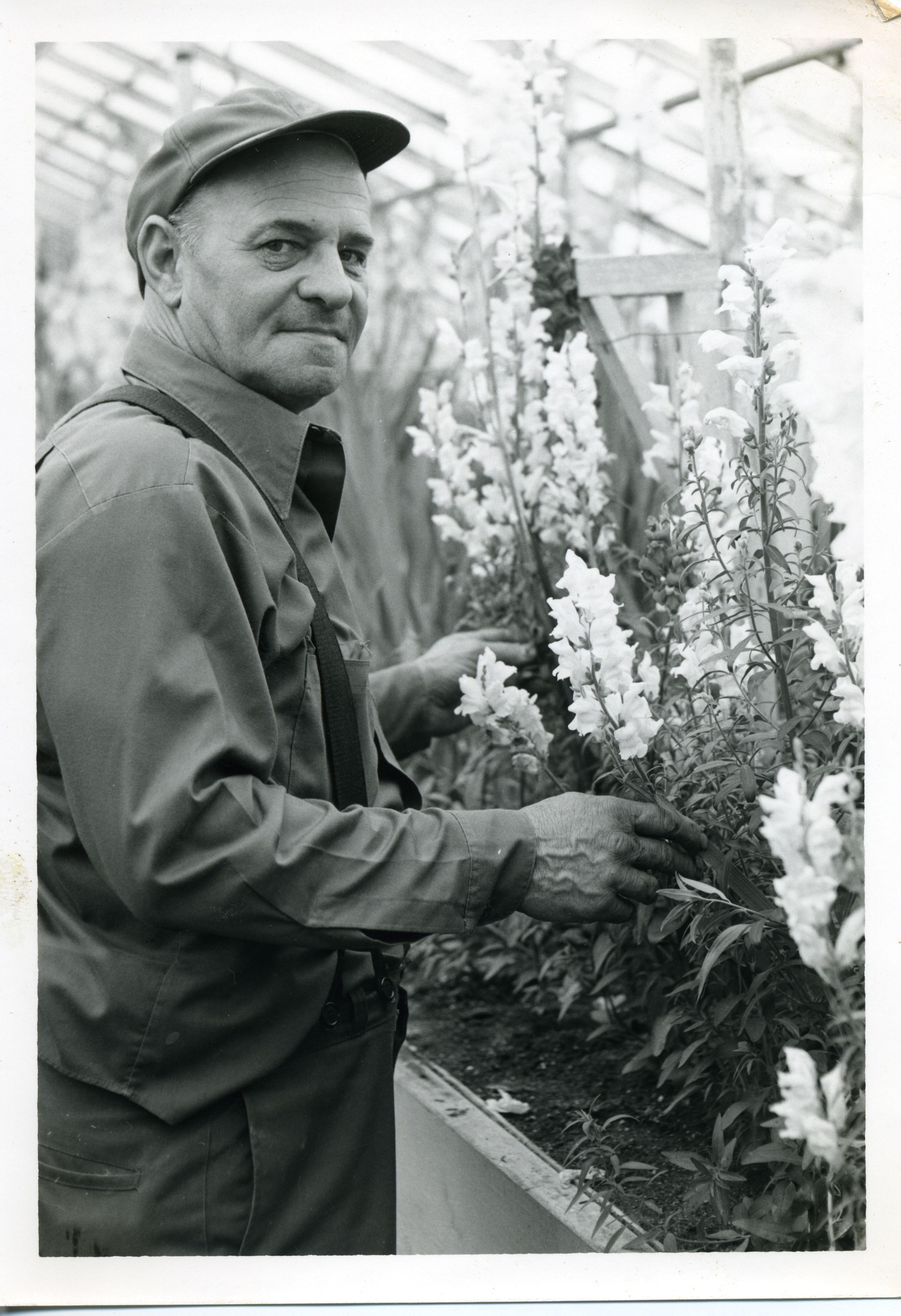 Black and white photo of a man standing in front of a row of flowering plants. He has on a baseball-type cap and a dark shirt and trousers. There is a strap over his shoulder that may be part of a set of suspenders. His head is turned toward the camera and his hands are touching the flowers. In the background is what appears to be parts of a green house. There is a white border on all sides. On the back in ink is "79%".