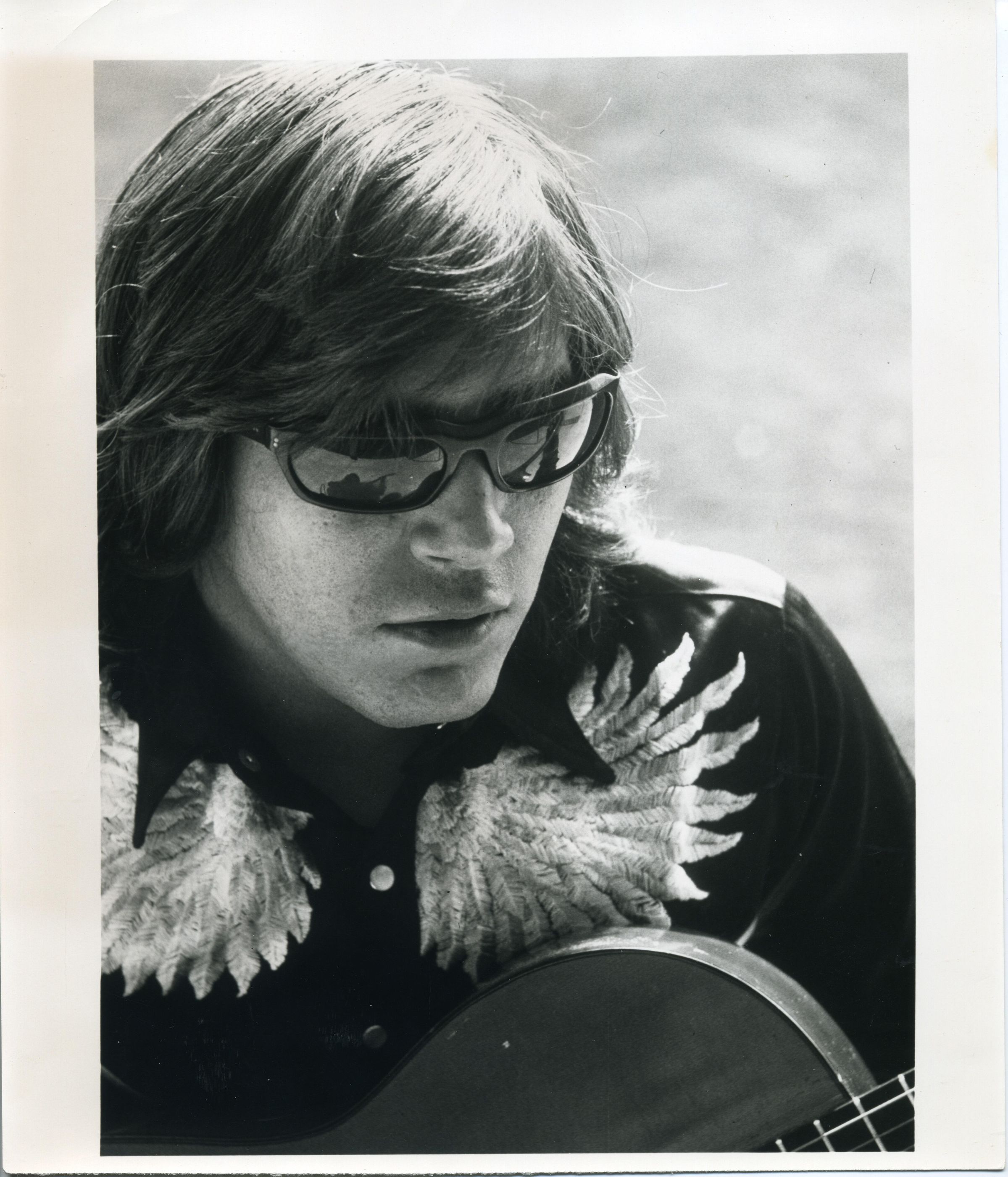 Black and white photo of Jose Feliciano. He has long dark hair and is wearing glasses. He has on a dark shirt with wing or feather decoration and a portion of a guitar is visible in front of him. There is a white border on all sides with the side borders being larger. On the back in pencil is "Jose Feliciano".Made/Created