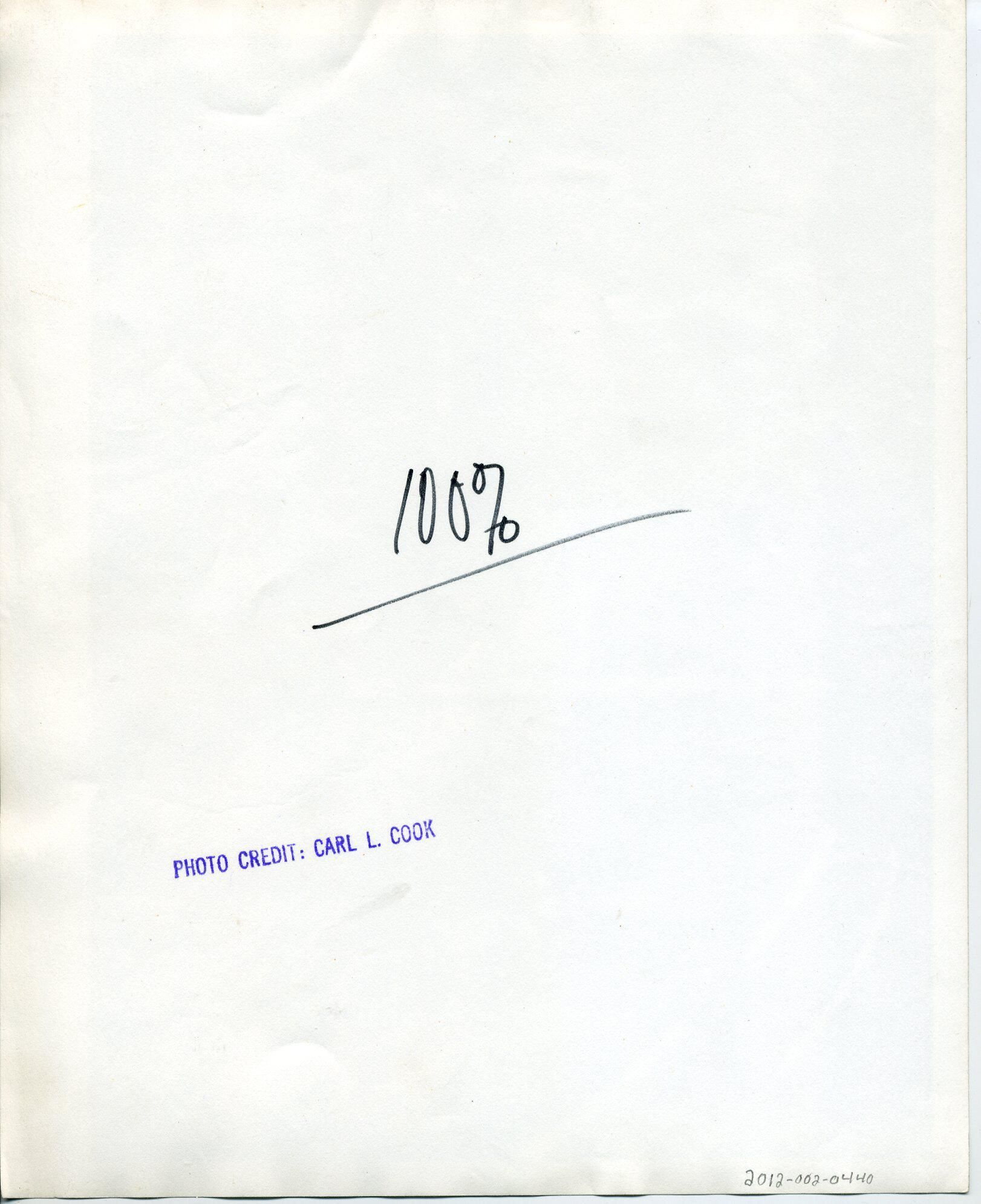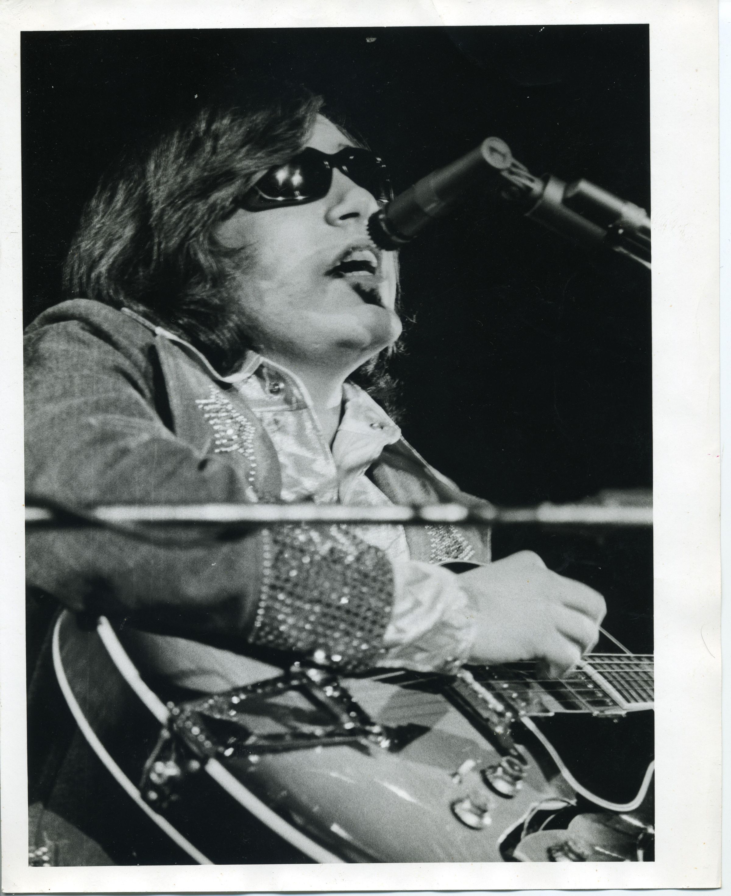 Black and white photo of a young man playing a guitar in front of a microphone. He has long dark hair and is wearing dark glasses. He has on a jacket with elaborate stitching and other decorations. He has a hand on the strings of a guitar visible in the foreground. There is a white border on all sides with the right border being larger. On the back in ink is "100%" and a purple stamp that says "Photo Credit: Carl L. Cook".