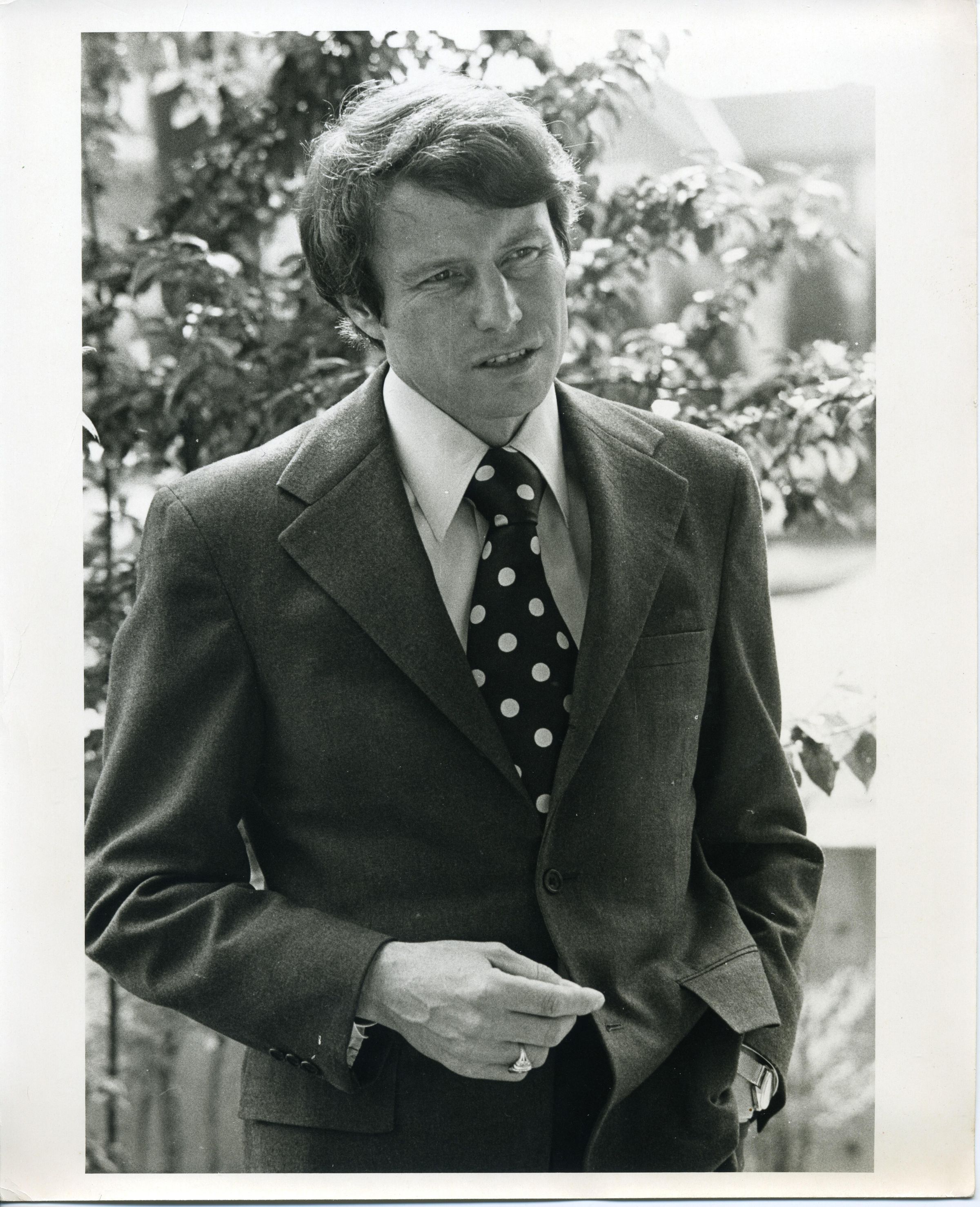 Black and white photo of Don Bonker. He has medium length dark hair and is wearing a dark suit over a white shirt and a polka dot tie. He is visible from the waist up, and one hand with a visible ring is held near his waist. On his other arm a watch is visible. In the background is a tree or other such foliage.