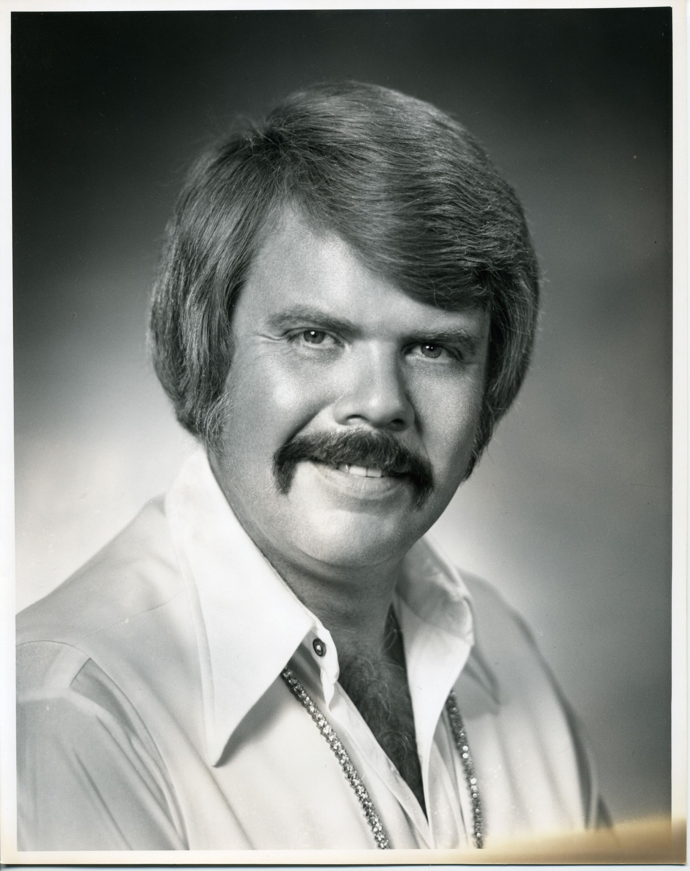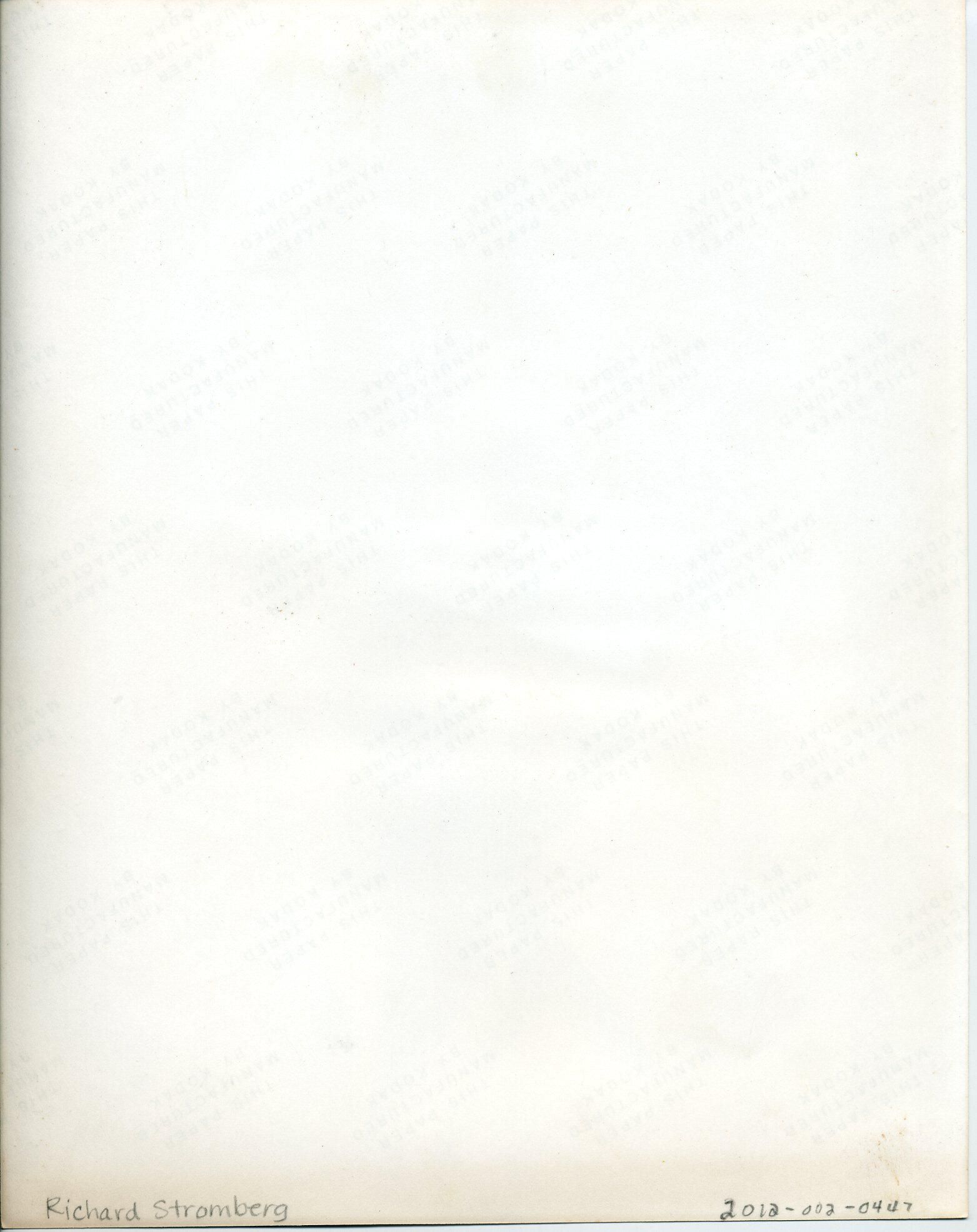 Black and white photo of Richard Stromberg. He has medium dark hair that falls below his ears and a mustache. He is wearing a white shirt that is open at the collar. A button is visible on the collar as is a silver colored necklace. There is a white border on all sides. On the back in pencil is "Richard Stromberg".Made/Created