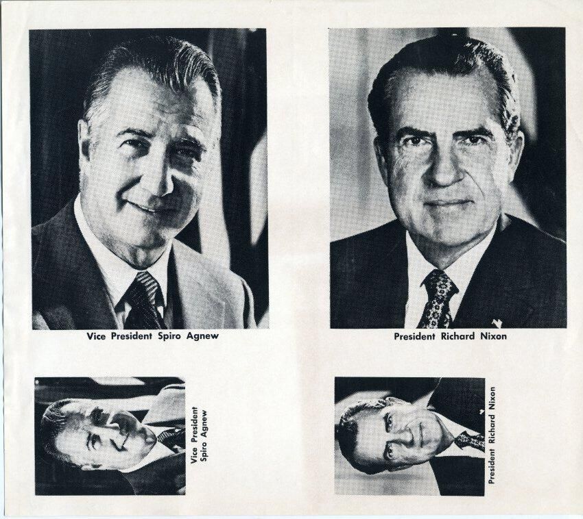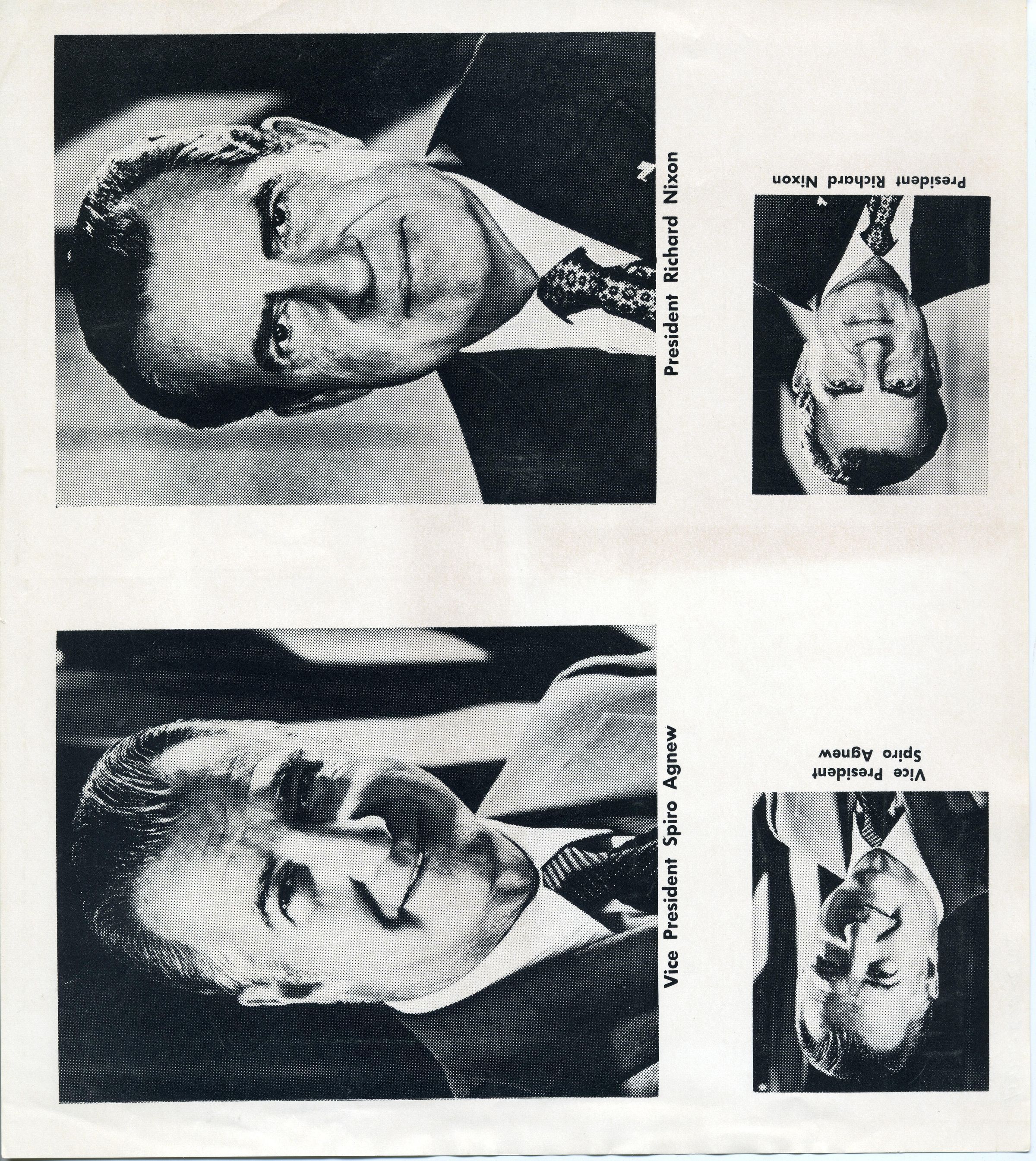Black and white printed images of President Richard Nixon and Vice President Spiro Agnew. President Nixon has short dark hair and is wearing a dark suit over a white shirt and patterned tie. Vice President Agnew has short dark hair combed straight back and is wearing a medium dark suit over a white shirt and a striped tie. Below the image of each gentleman is a smaller but otherwise identical image turned 90 degrees. Under each image is printed the man's name and title. The back of the paper is blank.Lexicon