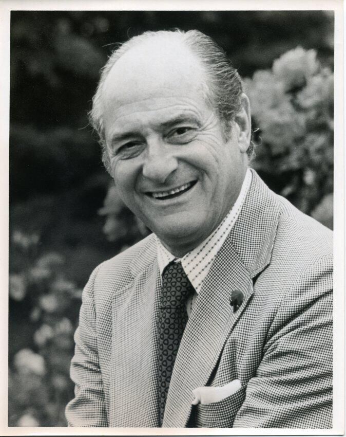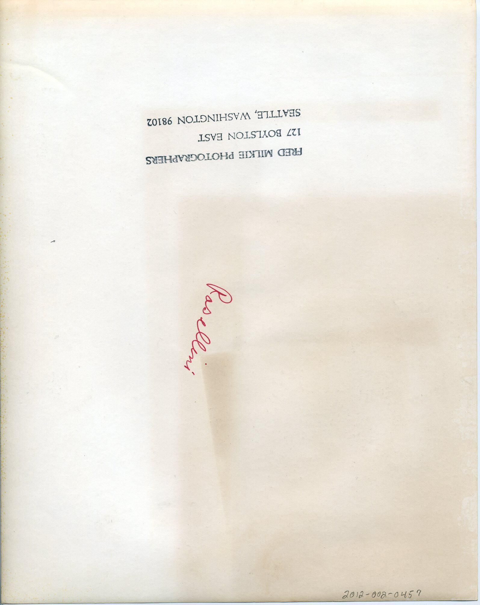 Black and white photo of a smiling Albert Rosellini. He is mostly bald with dark hair above his ears. He is wearing a checked jacket over a white shirt with a pattern and a patterned tie. There is a handkerchief in his lapel pocket and a pin on his lapel. There is foliage in the background and a white border on all sides. On the back in red ink is "Rosellini" and a stamp in black ink saying "Fred Milkie Photographers 127 Boylston East Seattle Washington 98102".Made/Created