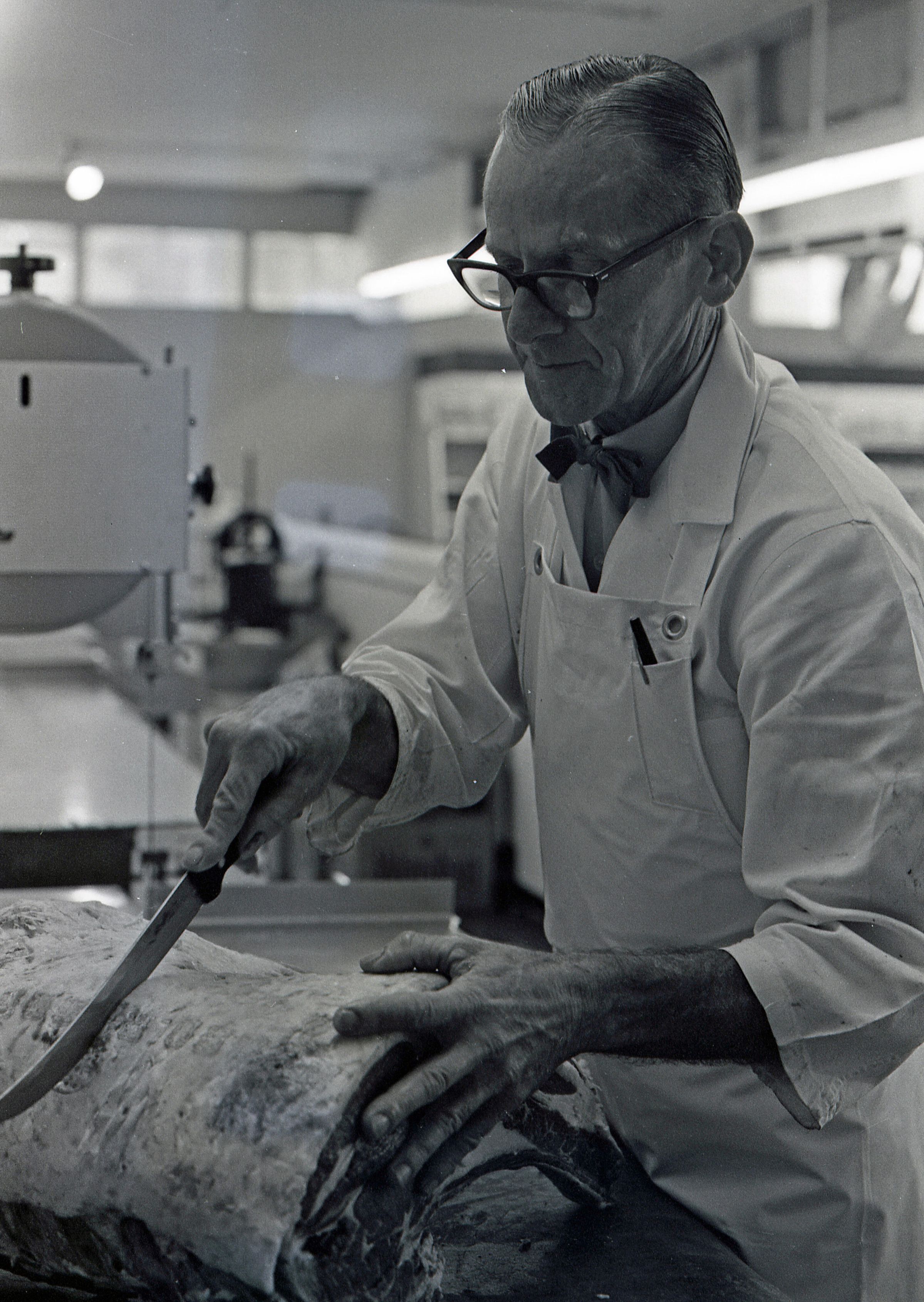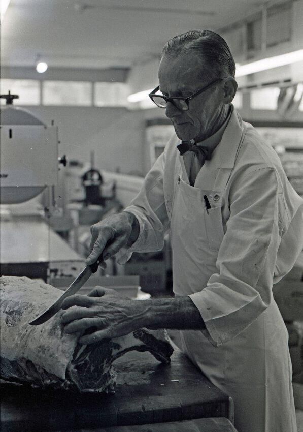 Lacey Foods Cole Retinee, 1973. These two black and white film negative strips were created for the Lacey Leader newspaper. These images show a man (Cole Retinee) in a commercial kitchen cutting bone-in ribeye steaks from a primal. Image 15 shows Mr. Retinee standing at his butcher block and preparing a tray to put the cut steaks into. There is a seated woman visible in the background with a small child seated on her lap. There is a sign partially visible hanging on the wall. The visible portion reads "IN THE NORTHWEST." Image 16 shows Mr. Retinee cutting steaks. There are two numbered tags and a cloth visible on the table next to the butcher's block. The knife is obscured behind the primal. Image 17 is similar to the previous image, but Mr. Retinee is holding the knife pointed downward and beginning a cut into the meat. Image 18 is nearly identical to image 16. Image 19 is very similar to image 17, but Mr. Retinee's knife is cutting further toward the far end of the primal. Image 20 shows Mr. Retinee making another cut. His left hand is on top of the primal. Image 21 shows Mr. Retinee making a cut all the way at the far end of the primal. Image 22 shows Mr. Retinee holding the primal with his fingertips at the end nearer to the camera. Image 23 shows Mr. Retinee making another cut. His lips are pursed in this image. Image 24 shows Mr. Retinee preparing to make another cut. The back edge of the knife is nearly parallel with the top of the primal.