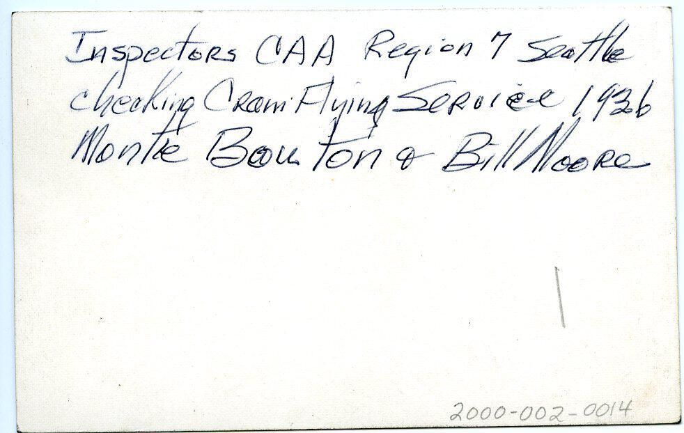 Inspectors CAA Region 7 Seattle checking Cram Flying Service 1936,Monte Bouton & Bill MooreLanguage