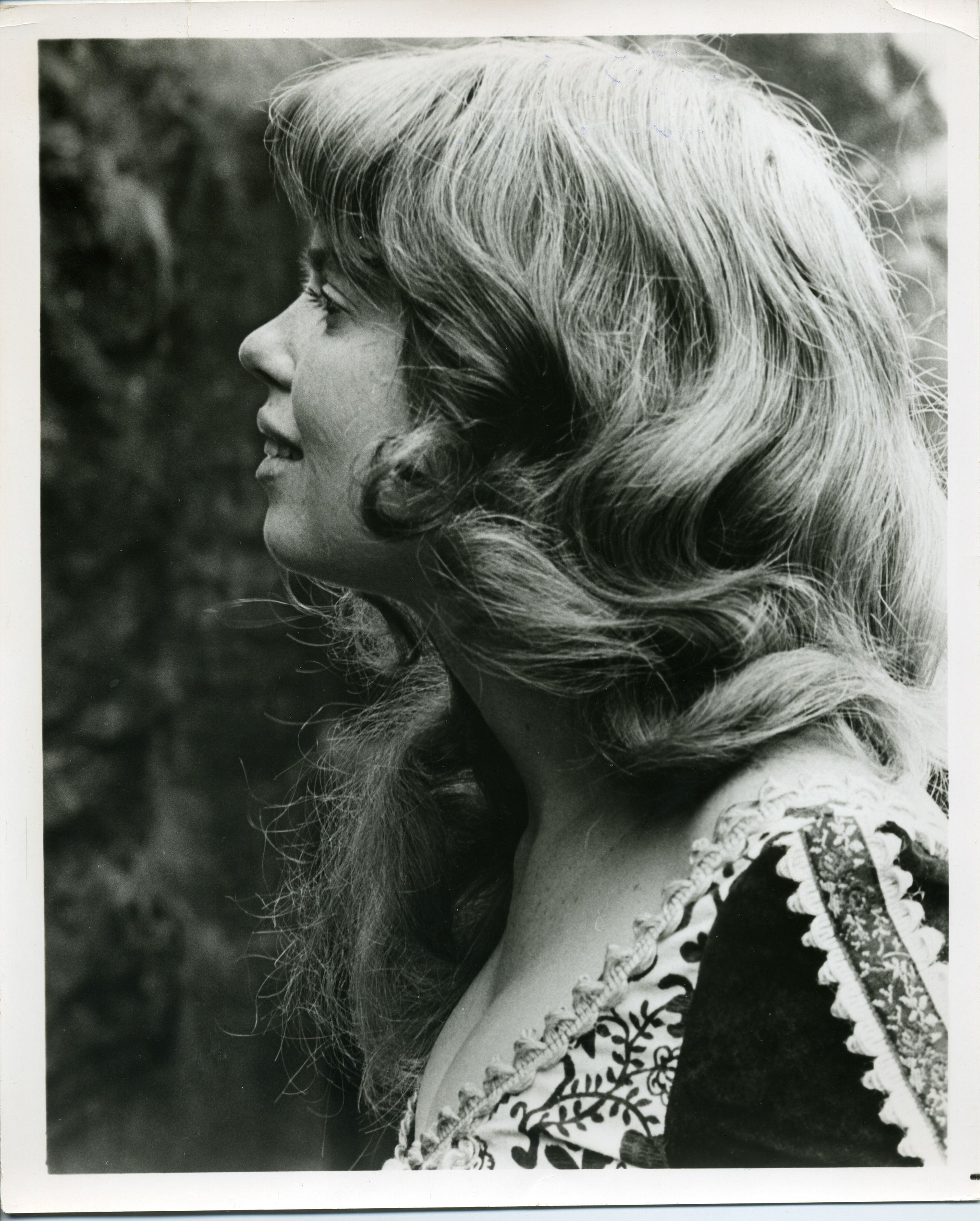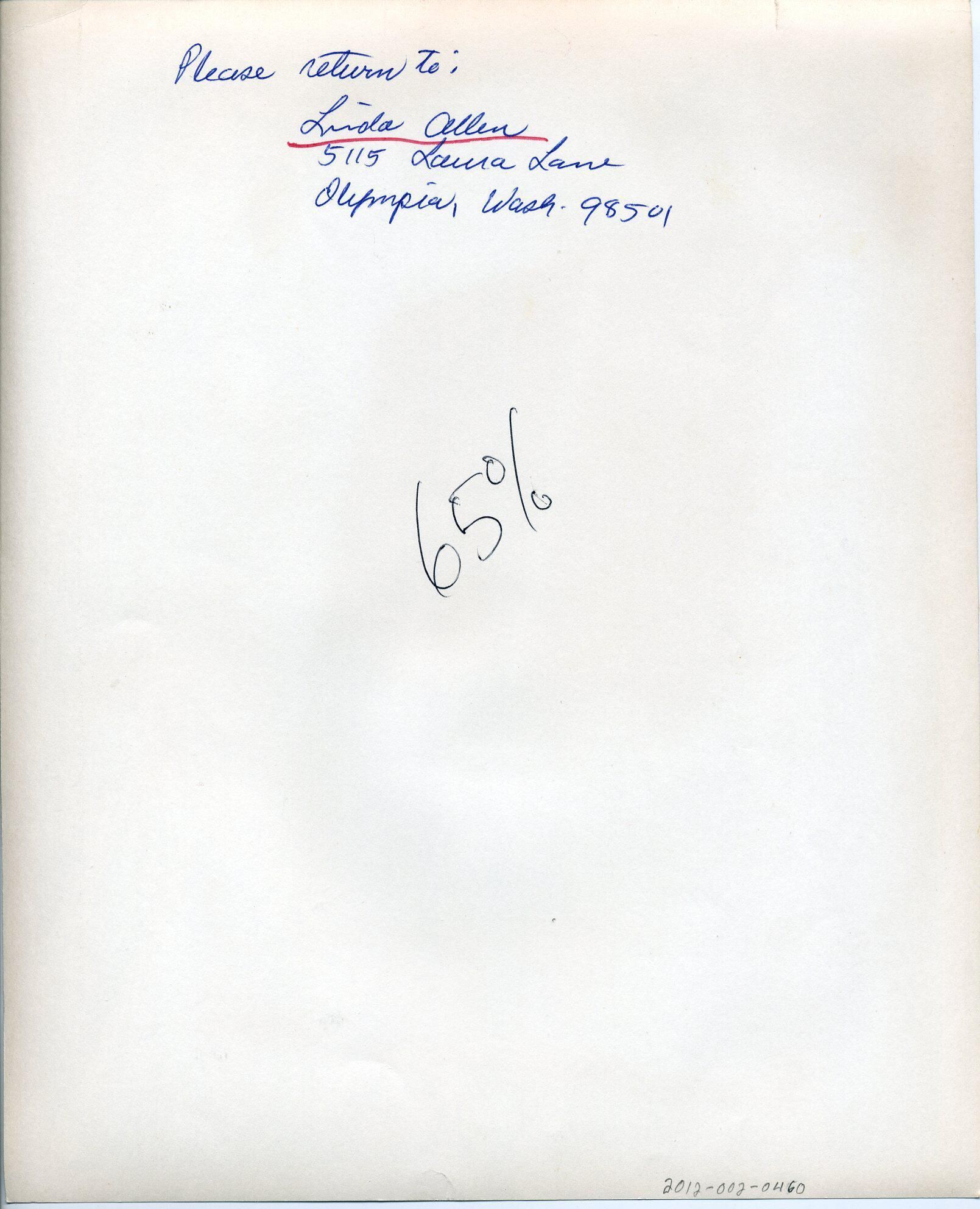 Black and white photo of Linda Allen. She has long light-colored hair that falls below her shoulders. She is wearing a black and white costume with decorations on the white part and a white knitted border. The image is a profile. There is foliage in the background and a white border on all sides. On the back in ink is "65%" and "Please return to Linda Allen 5115 Laura Lane Olympia Wash 98501".
