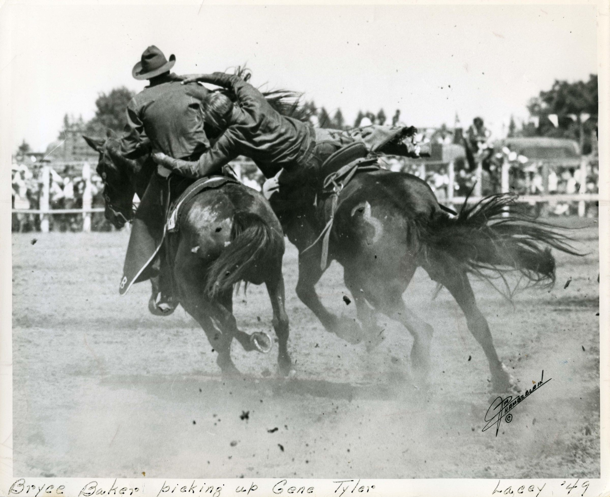 8 x 10 black and white photograph depicts a rodeo action shot of what is likely a Saddle Bronc Riding event at the Mountain View Ranch in Lacey, Washington. Bryce W. Baker, left, is picking up Gene Tyler, right. A pick-up rider assist rodeo riders by riding next to the bucking horse at the end of the ride and providing stability while the competitor jumps or swings free.Context