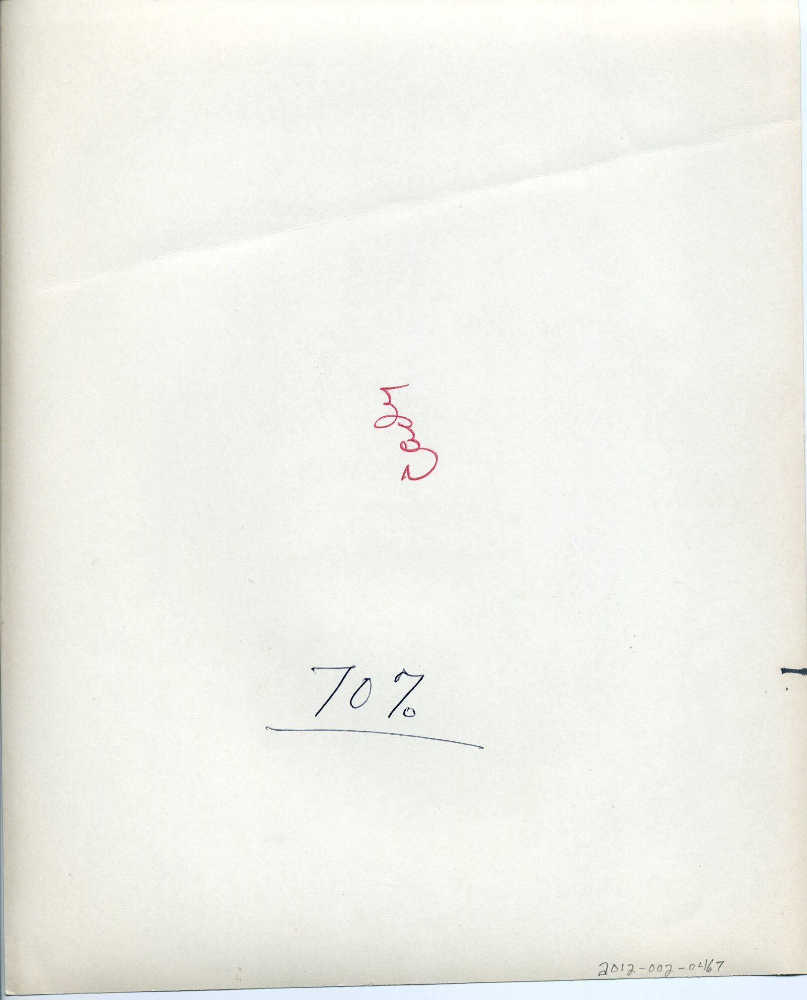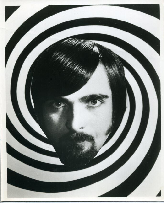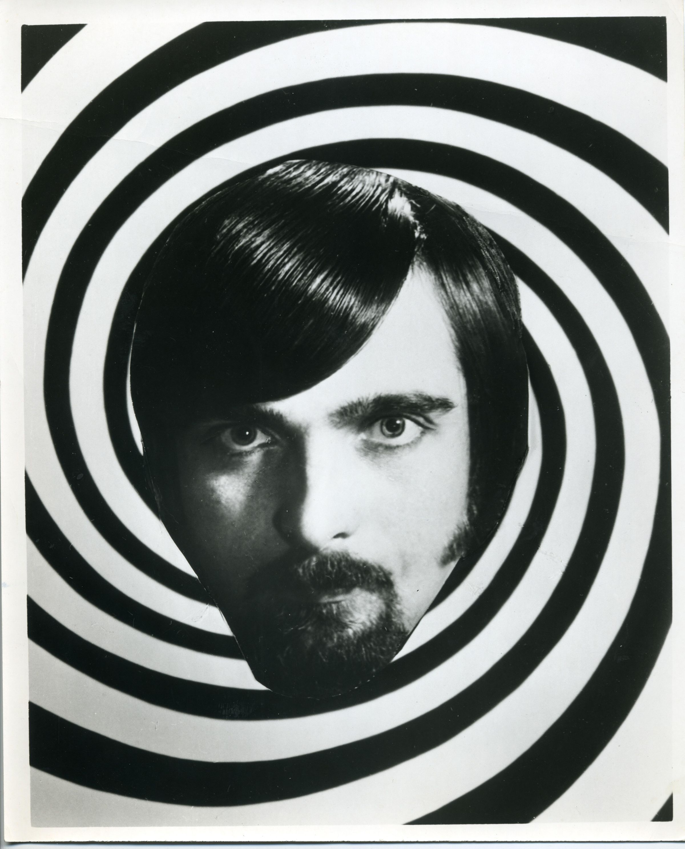Black and white photo of a man identified only as "Cody". Only his head and face is visible inside a background of black and white spiralling lines. He has black, shiny hair and a black mustache and beard. there is a white border on all sides of the print. On the back in red ink is "Cody" and in blue ink "70%".