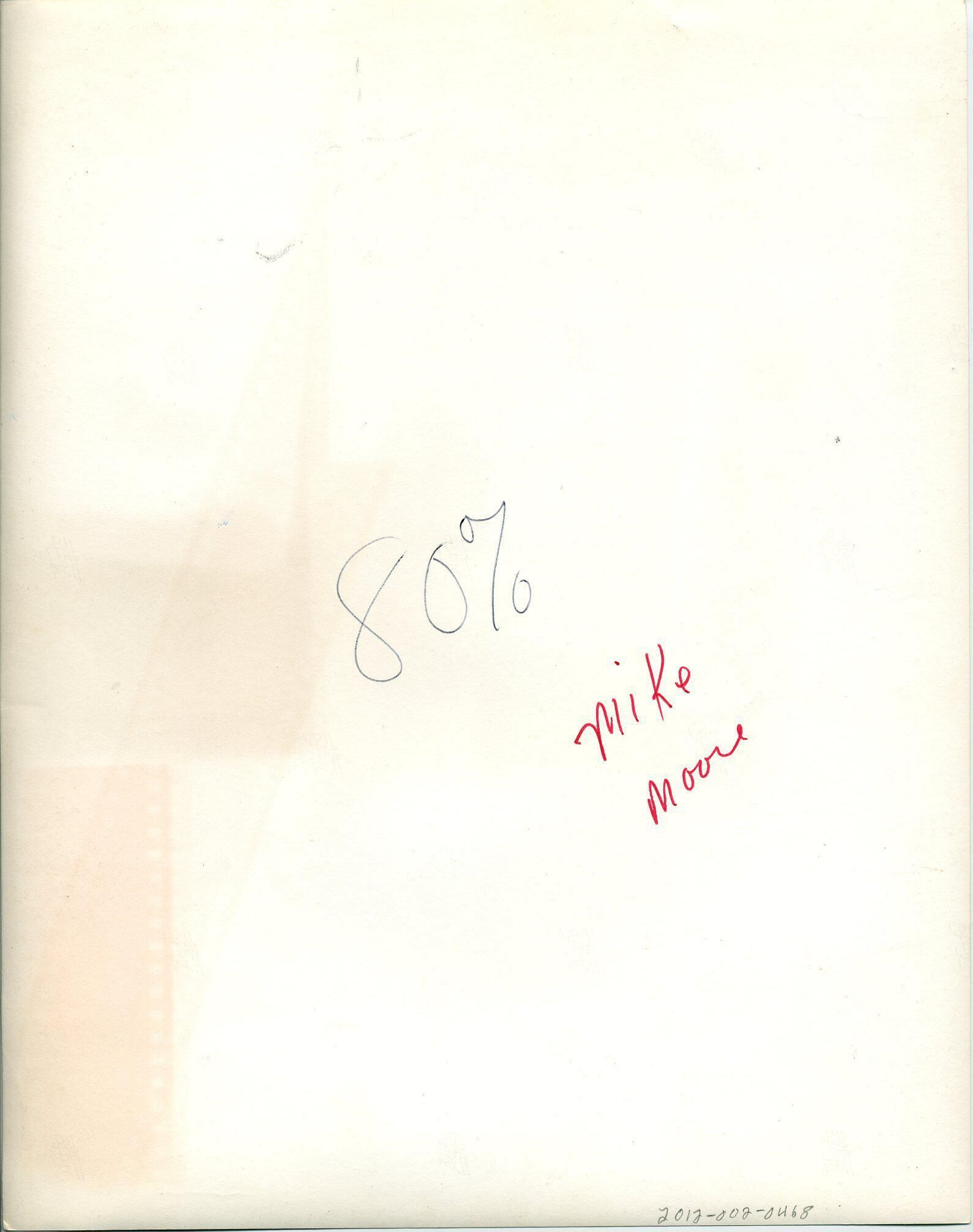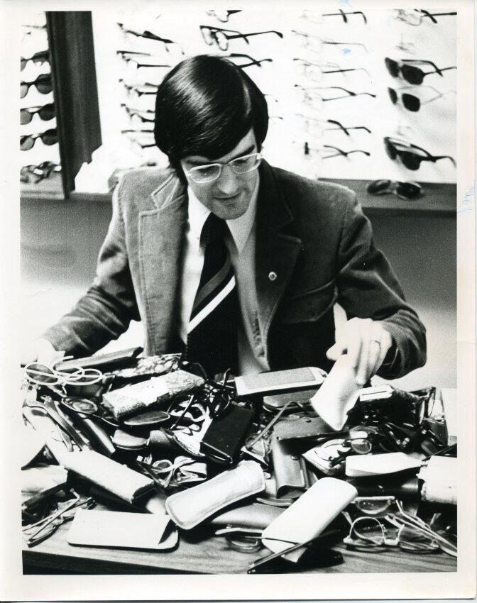 Black and white photo of Mike Moore. He has dark, shiny hair and is wearing glasses. He is wearing a dark suit over a white shirt and a striped tie. There is a membership-type pin in his lapel. He is sitting in front of a table piled high with eye glasses and glass cases. He is looking down at the table and has a glass case in one hand. On the wall behind him is a board with glasses on it. There is a white border on all sides. On the back in red ink is "Mike Moore" and in blue ink is "80%".
