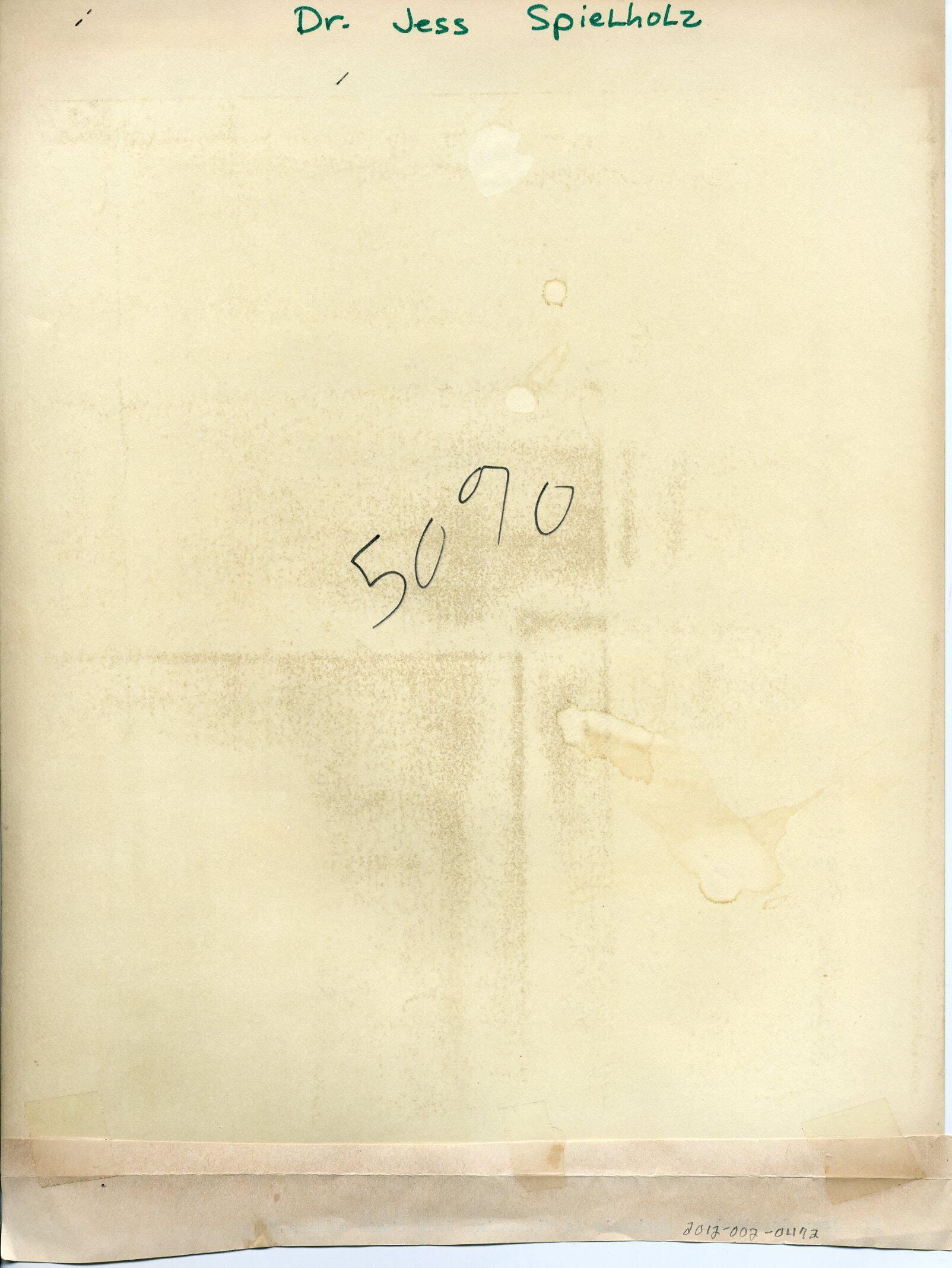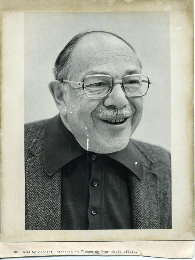 Black and white photo of a smiling Jess Spielholz. He is mostly bald and is wearing glasses. He has on a herringbone jacket over a dark shirt buttoned at the collar. There is a white border on all sides and a strip of paper attached to the bottom has typed "Dr. Jess Spielholz: emphasis is 'learning from their elders.'". On the back in green ink is "Dr. Jess Spielholz" and in blue ink "50%".