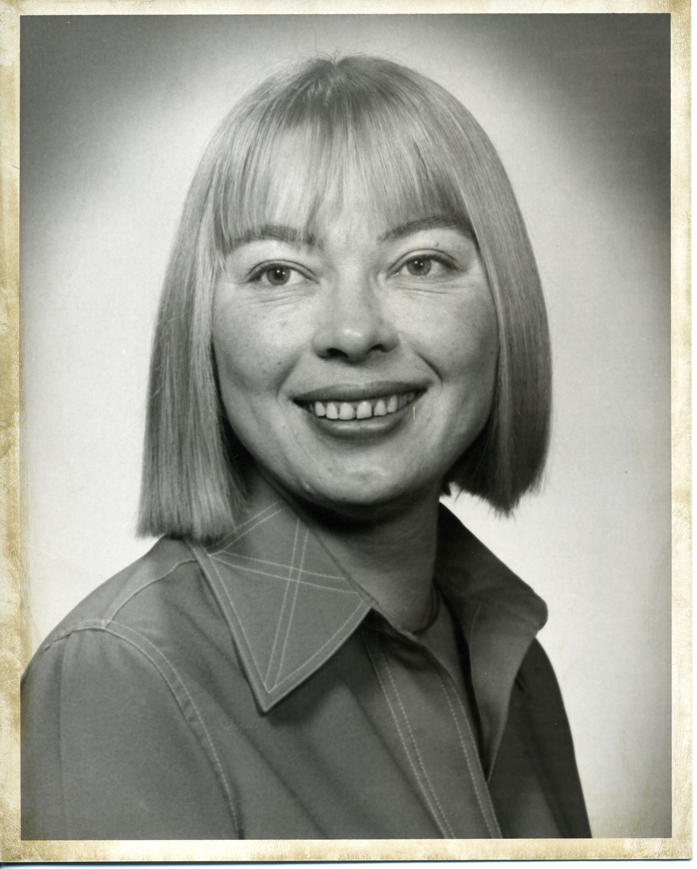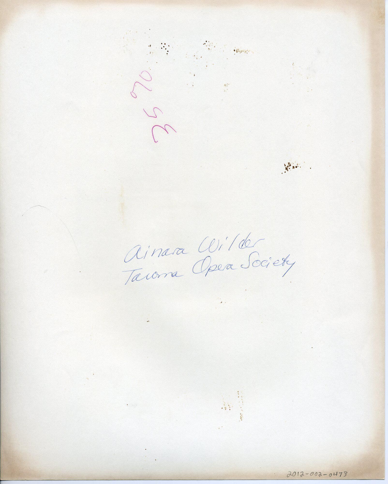 Black and white photo of a smiling Ainara Wilder. She has light shoulder length hair and is wearing a light-colored dress open at the collar. There is a white border on all sides. On the back in blue ink is "Ainara Wilder Tacoma Opera Society" and in red ink "35%".