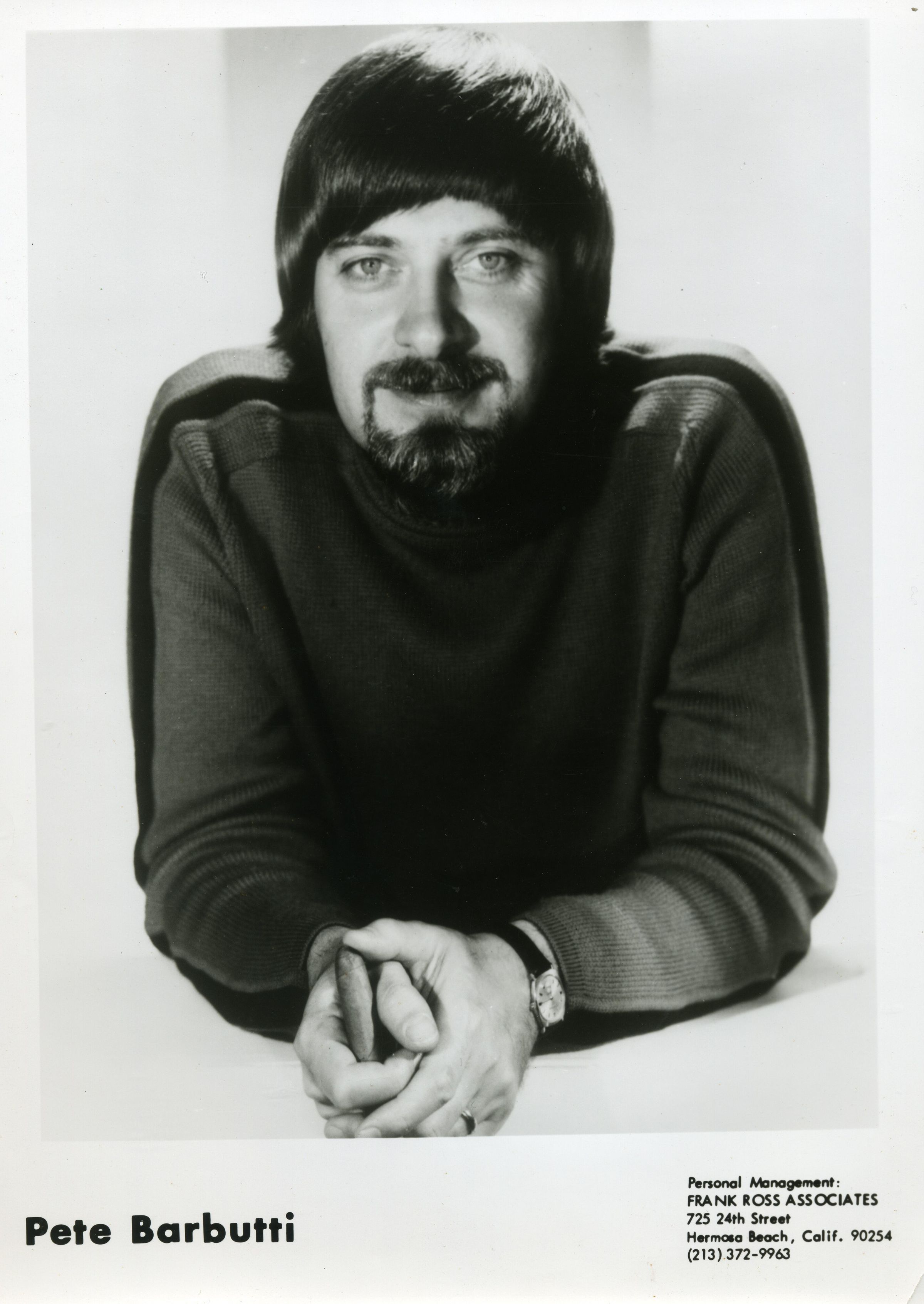Black and white photo of Pete Barbutti. He has long, dark hair and a mustache and beard. He has on a dark sweater with a stripe on the shoulder and arms. He is leaning toward the camera and has his hands folded and a watch is visible on one arm. There is a white border on all sides and on the larger bottom border is "Pete Barbutti" and "Personal Management: Frank Ross Associates 725 24th Street Hermosa Beach, Calif. 90254 (213) 372-9963". There is no information on the back.Made/Created