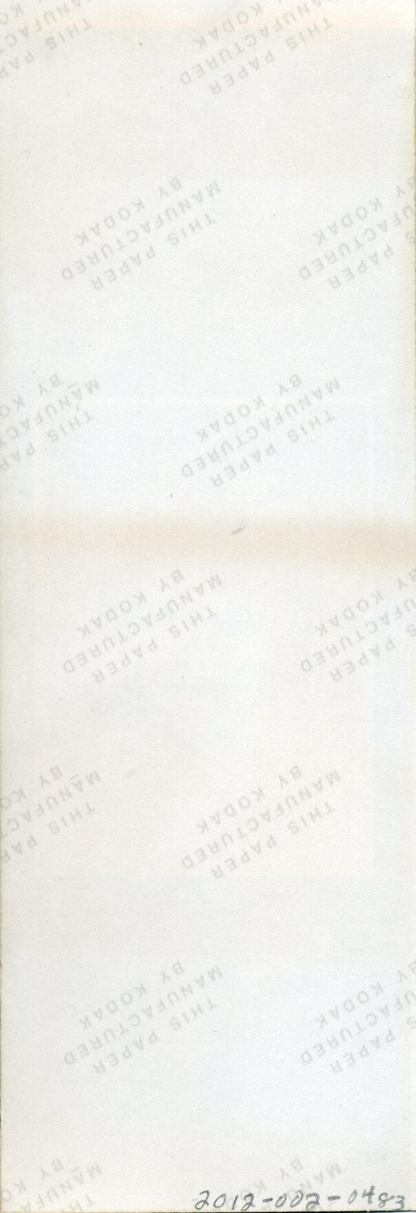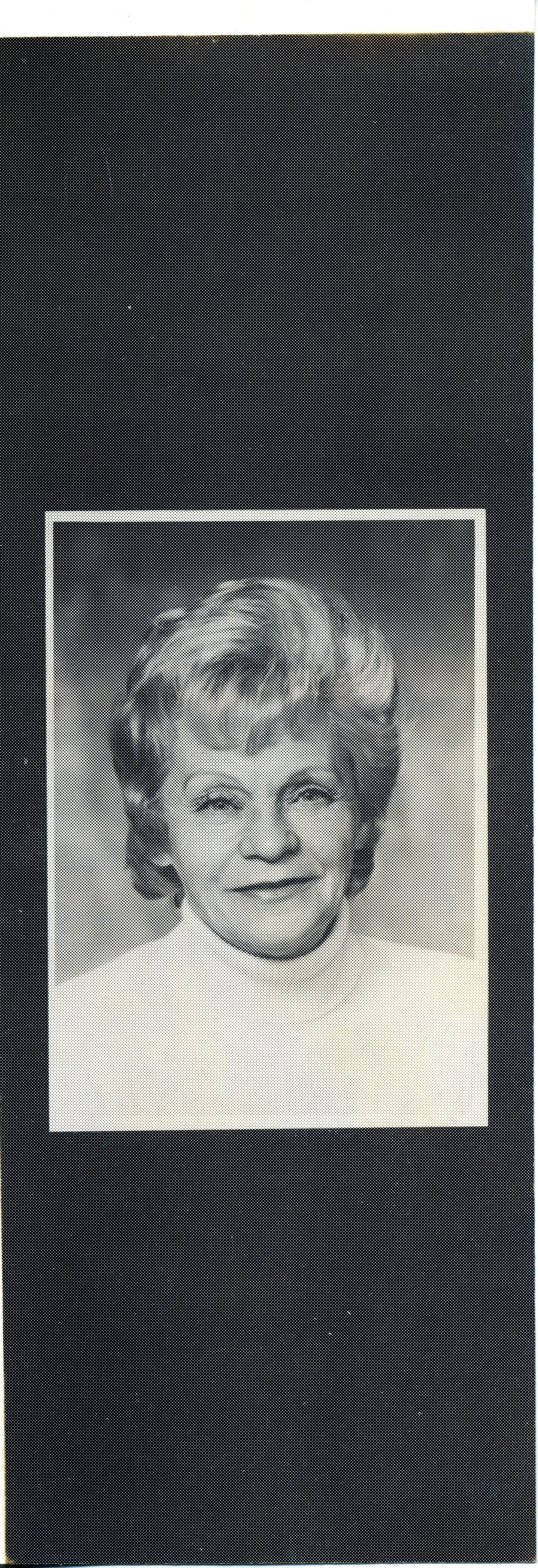Black and white photo of an unidentified woman. She has medium length gray hair and is wearing a white turtle neck sweater. The image is centered on a longish paper so that there is a large black border at the top and bottom and a small black border at the sides. On the back is the repeated statement "This paper manufactured by Kodak".Made/Created