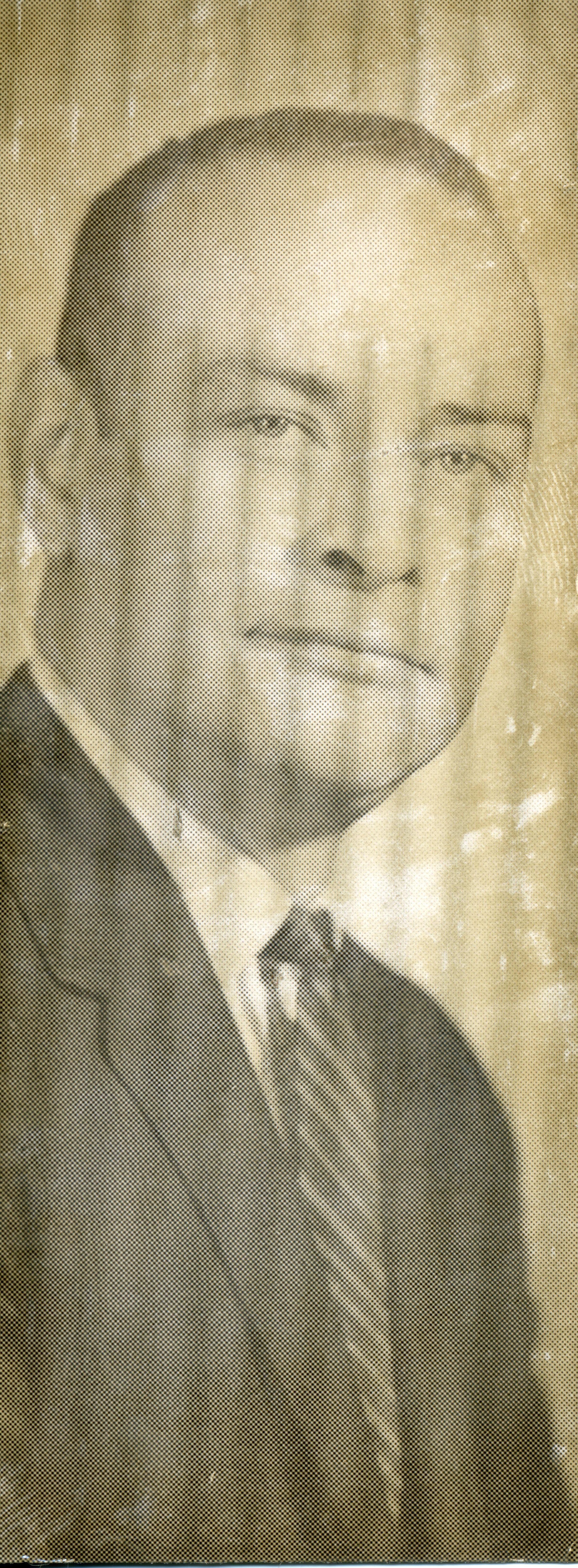 Black and white photo of Dan Clabaugh. He is partially bald with some dark hair. He has on a dark suit over a white shirt and a striped tie. On the back in pencil is "Dan Clabaugh".Made/Created