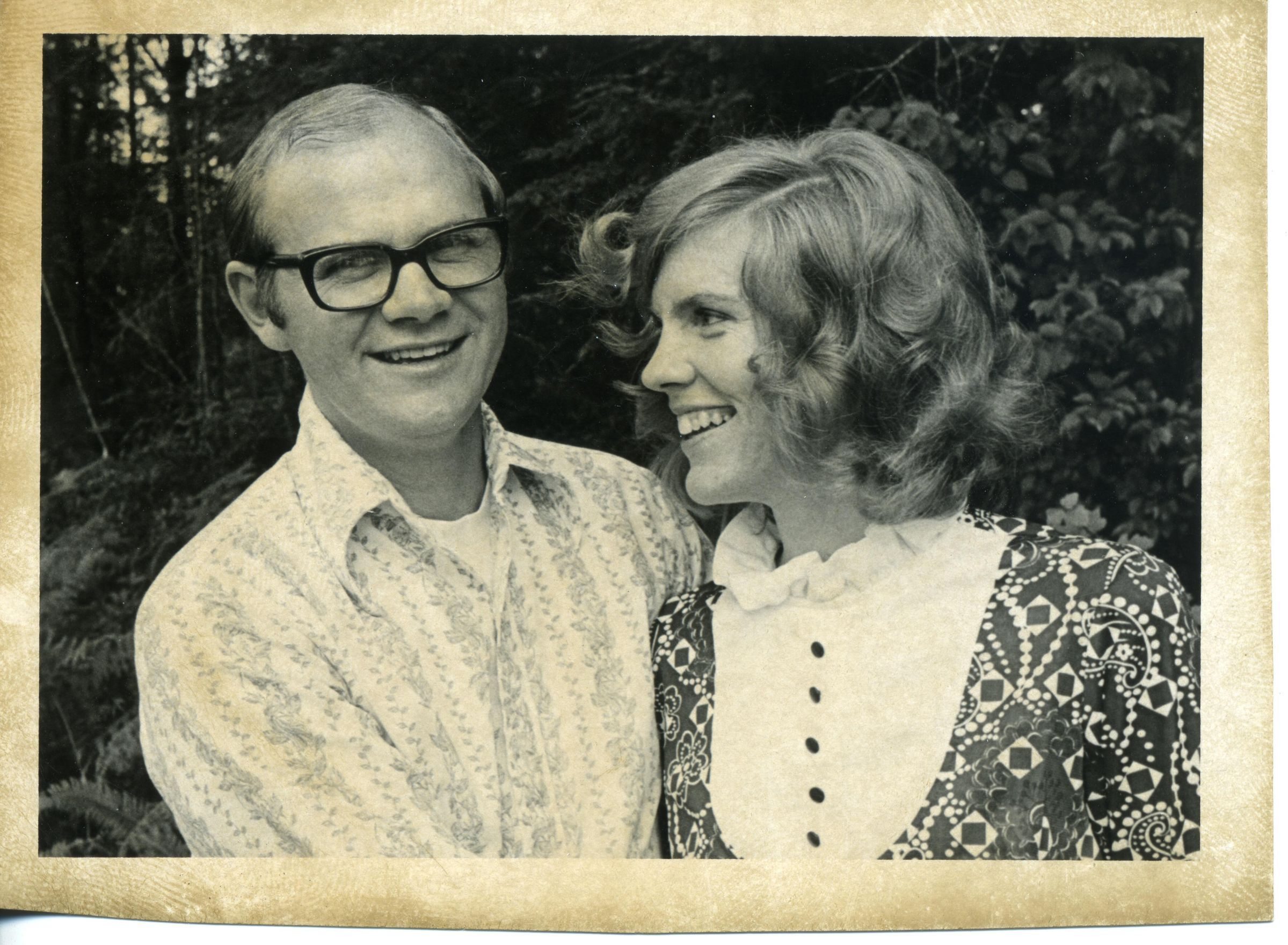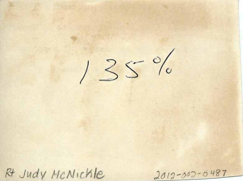 Black and white photo of Judy McNickle and an unidentified man. The man is partially bald and is wearing glasses. He has on a white shirt with patterns over a white Tee. Judy has medium length light hair and is wearing a dress that is dark in the body with white figures and the dress has a white bib with a ruffled collar and buttons down the front. In the background are trees. There is a white border on all sides. On the back in ink is "135%" and in pencil "Rt Judy McNickle".