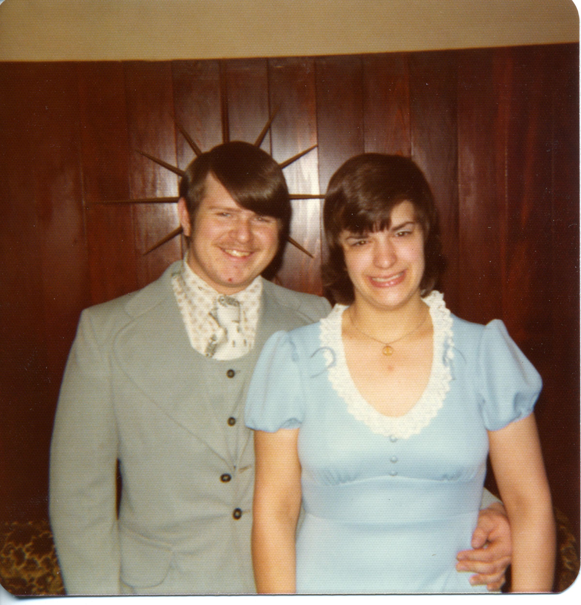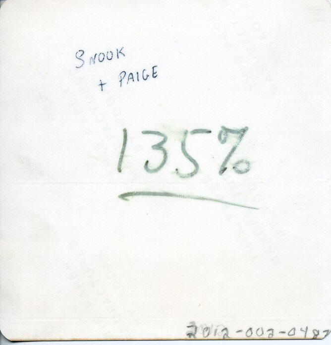 Color photo of a man and woman identified as "Snook and Paige". The man has medium length brown hair and is wearing a gray suit over a white shirt that has a pattern and a white tie with a pattern. Buttons are visible down the front of the suit. The woman has medium length brown hair and is wearing a blue dress with a white collar. A necklace is visible on the woman. The man's arm is around the woman and his hand is visible on her hip. Behind them is wood panelling and what appears to be part of a decorative clock. There is a brown strip at the top of the image which may be the ceiling. On the back in ink is "Snook & Paige" and in green felt pen "135%".